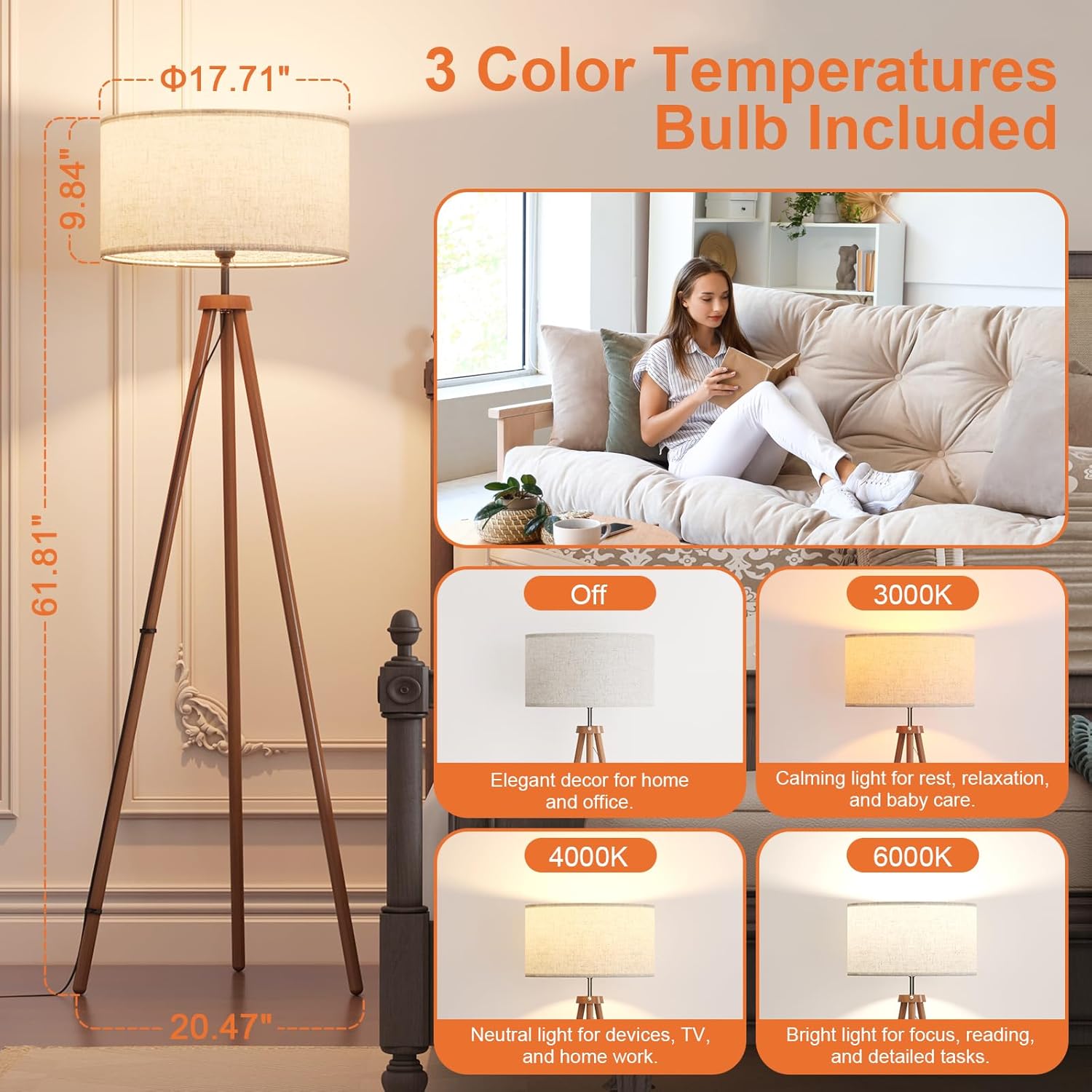 - 【Durable Solid Wood Tripod】: This lamp for bedroom features a high-quality natural rubber wood tripod, known for its durability, stability, and aesthetic appeal. The solid wood construction of this LED floor lamp ensures a firm, crack-resistant design that is sturdier than metal stands, providing a stable base that remains secure around children and pets. This LED corner lamp is ideal for enhancing any room, whether it’s the living room, bedroom, office, dorm, or reading nook.