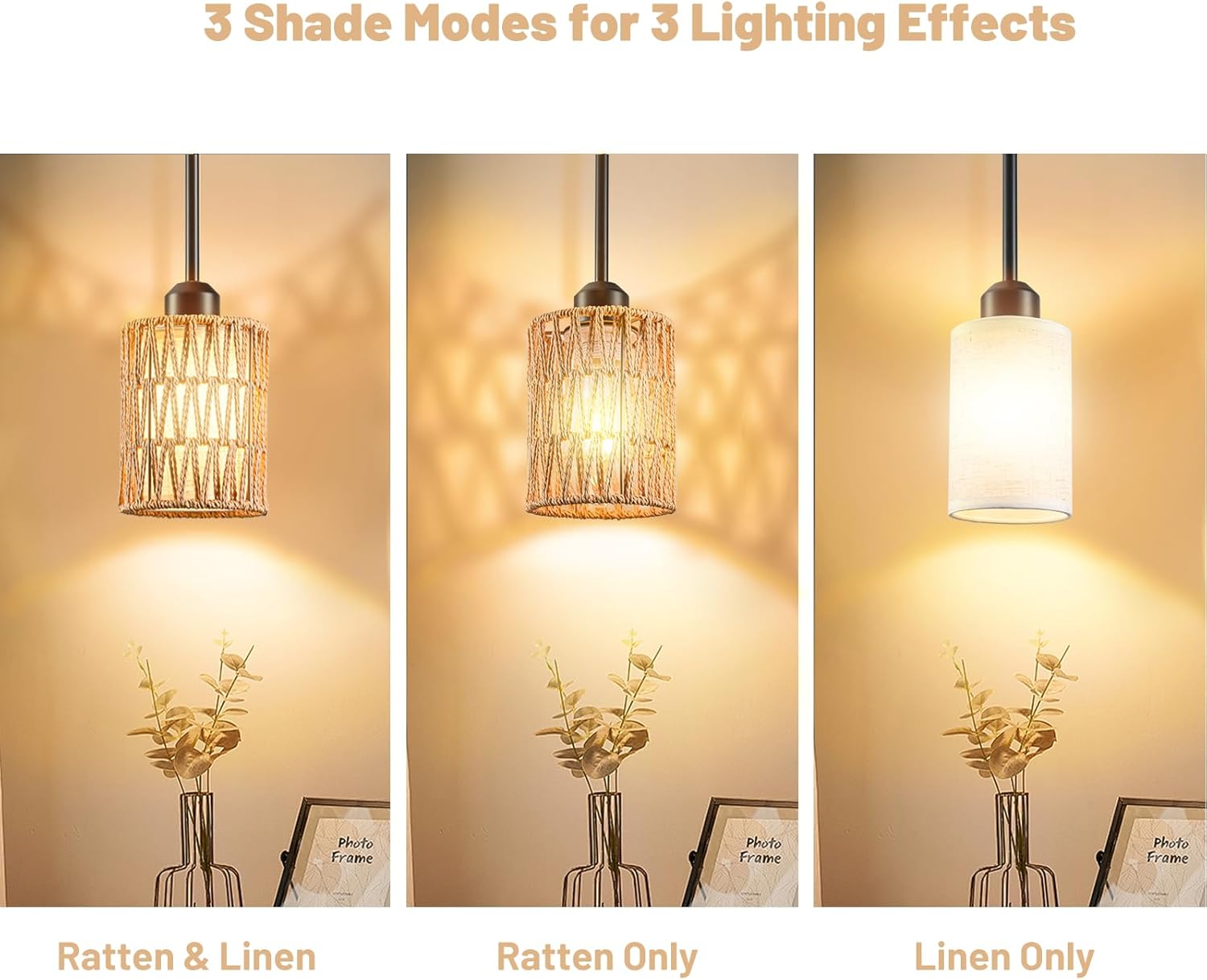 Pendant Light Boho Hanging Lamp, Rattan Hanging Lights with 2 in 1 Linen & Woven Shade, Ceiling Light Fixtures for Kitchen Island, Dining Room, Farmhouse, Bedroom (1 Pack)