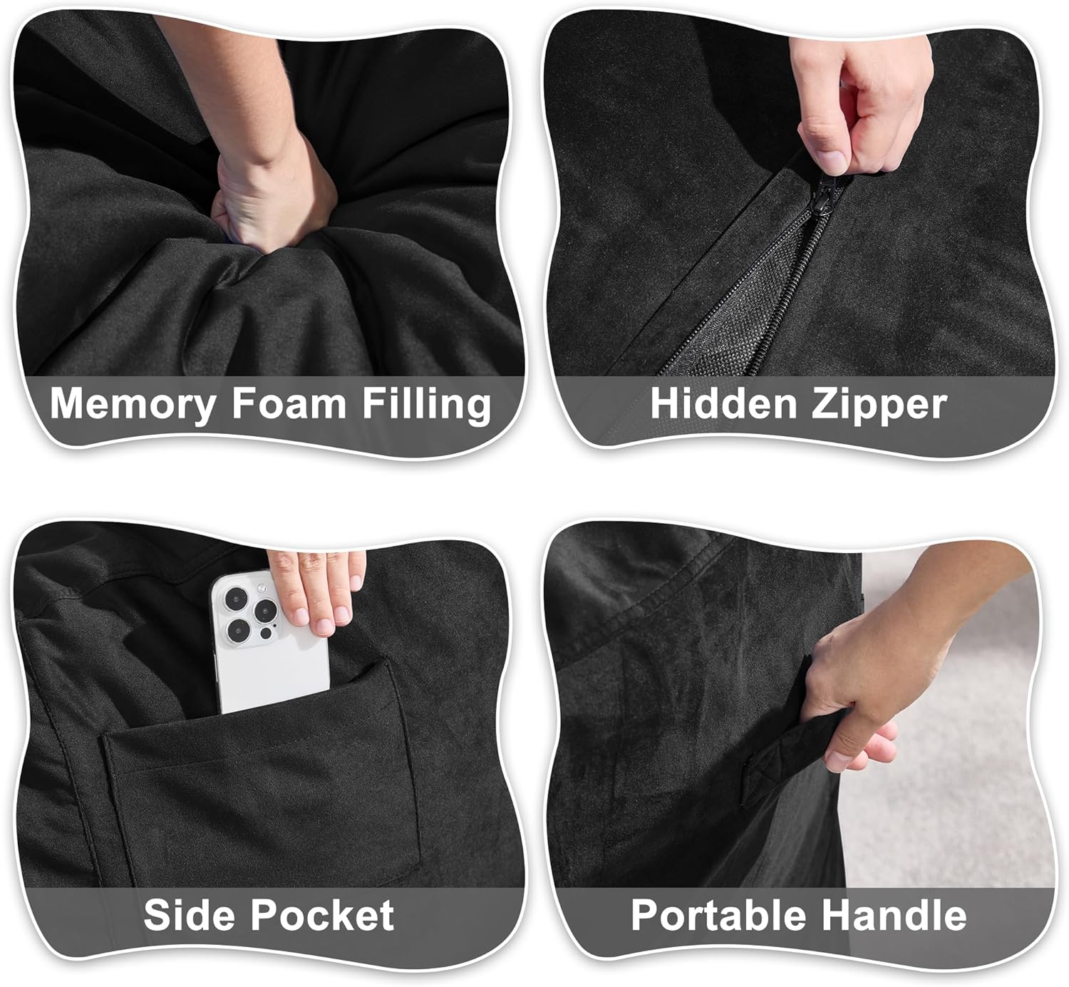 - Convenient Design: Our adult bean bag chair is designed with handle so you can move the giant bean bag chair wherever you want. The adult bean bag chair has a medium sized pocket on the side to store your phone, remote control, books and some small items. With the hidden zipper, you can remove the bean bag cover and throw it in the washing machine for cleaning.