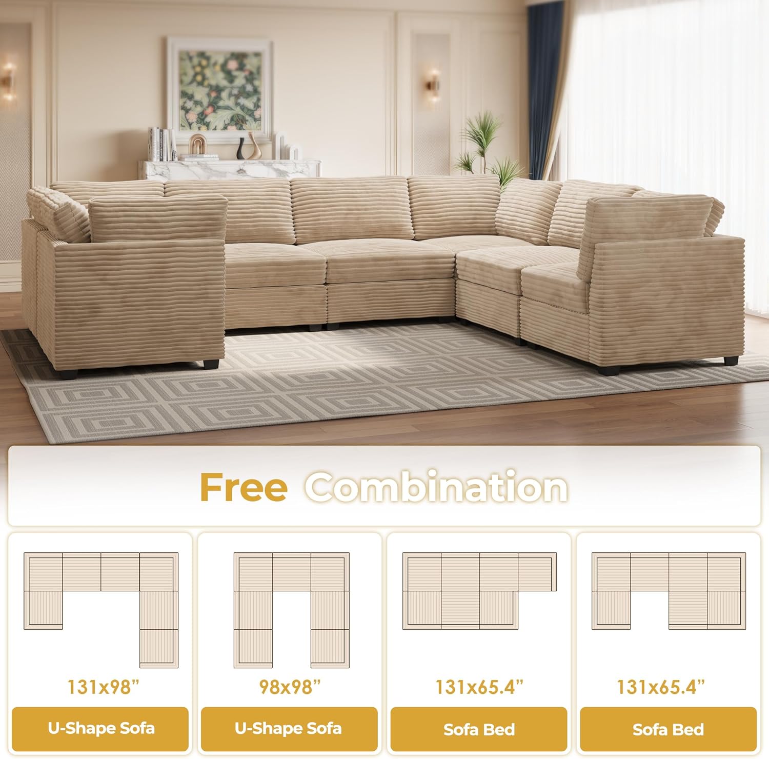 HOOOWOOO Modular Sectional Sofa,7 Pieces Sectional Couches for Living Room,131X98 U Shaped Cloud Couch Set(Beige Velvet Corduroy)