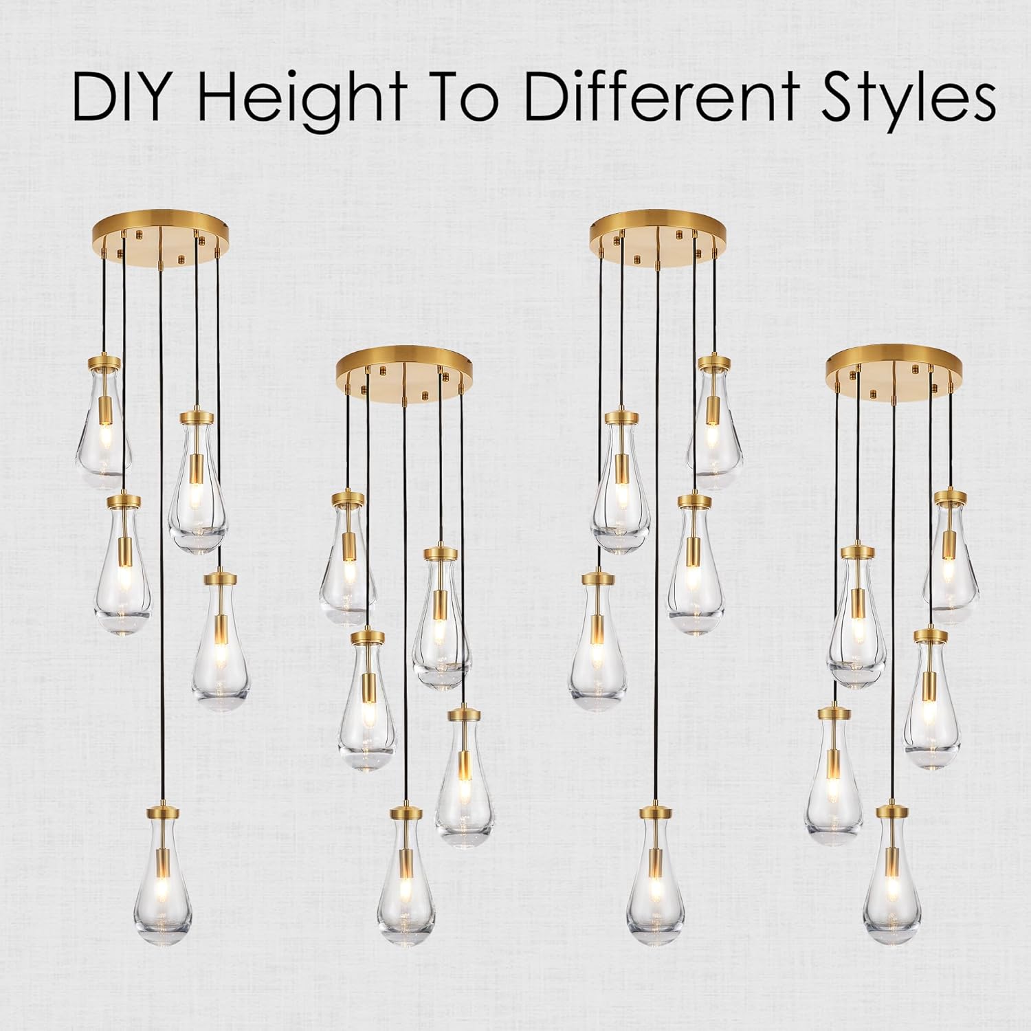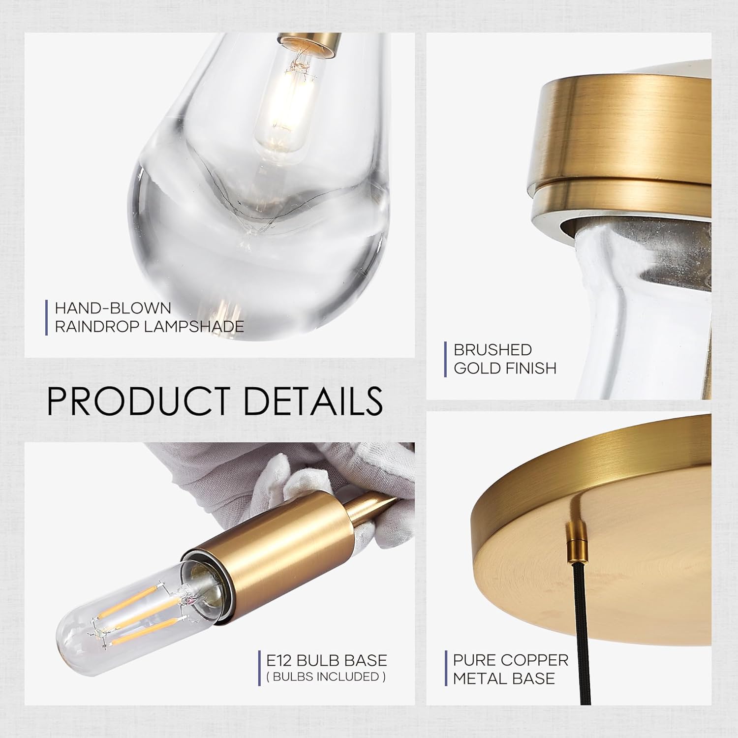 5-Light Raindrop Pendant Light Fixtures, Brass Glass Pendant Lighting, Teardrops Modern Hanging Light for Entryway Foyer Kitchen Island Dining Living Room Hallway