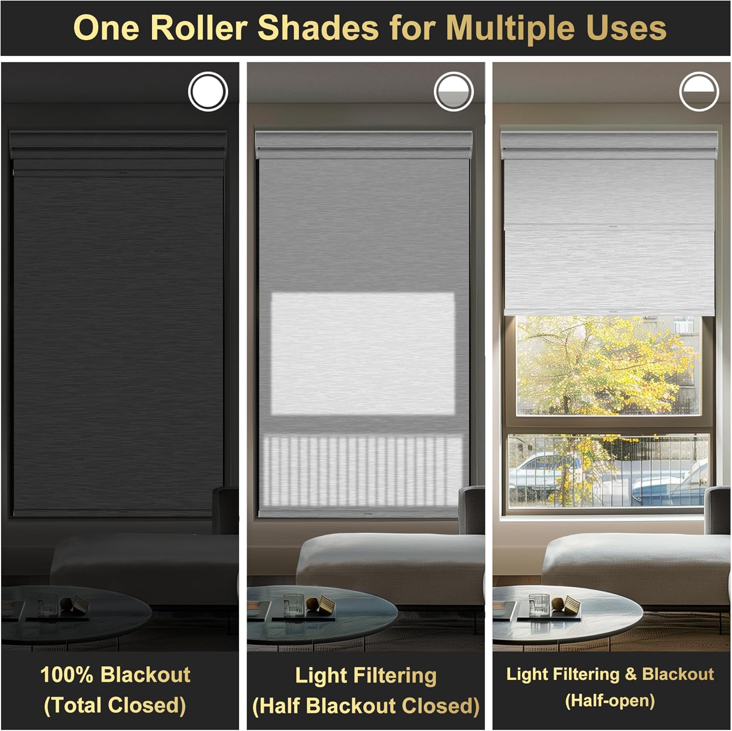 - MULTI-PURPOSE SHADE:Dual roller shades consisting of blackout and light filtering shades, blackout roller shade can 100% blackout,thermal insulation and UV Protection,so that you can experience quiet and comfort of the night during daytime;Light filtering roller shade allow light to filter into your room,and no glare,soft diffused light allow for perfect balance of light and darkness,and also enhances overall aesthetics of your home,allowing for a romantic and comfortable living environment.