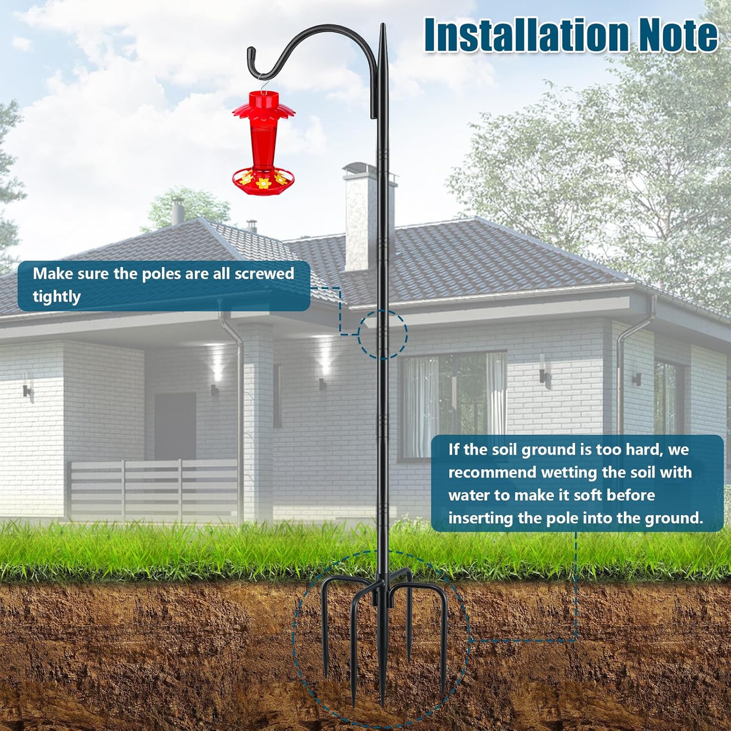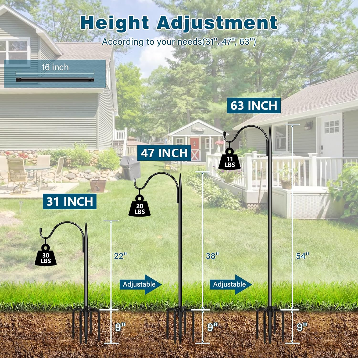 - Adjustable Height: The small shepherds hooks are available in 2 sizes, 47 in and 63 in, suitable for different garden space layout needs. Specifically, the 47-inch model can be adjusted down to 31 inches by removing one 16-inch pole section, while the 63-inch model can be adjusted to 47 inches or 31 inches by removing 1 or 2 sections respectively
