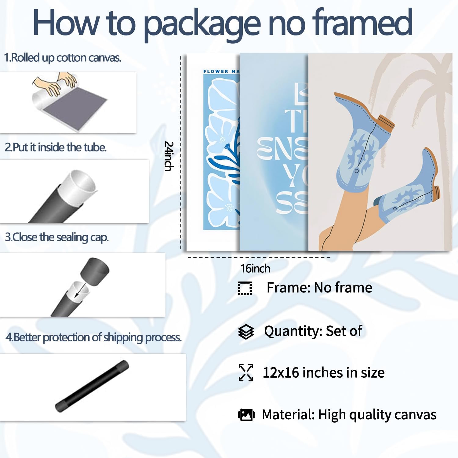 Blue Preppy Canvas Wall Art Posters Set of 3 Trendy Cowgirl Boots Home Decor Flower Market Painting Prints Coastal Aesthetic Picture for Girls Bedroom Bathroom Living Room Dorm 12x16Inch Unframed