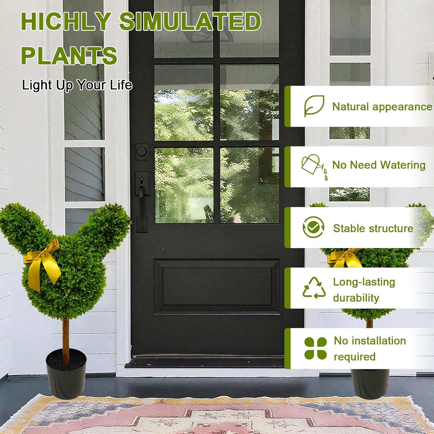 2 Pcs Artificial Bunny Shaped Topiary Trees, Artificial Green Boxwood Bunny Decorations with Gold Bow, Perfect for Indoor & Outdoor Front Porch, Easter& Garden Decor (Bunny Shaped Topiary Tree)