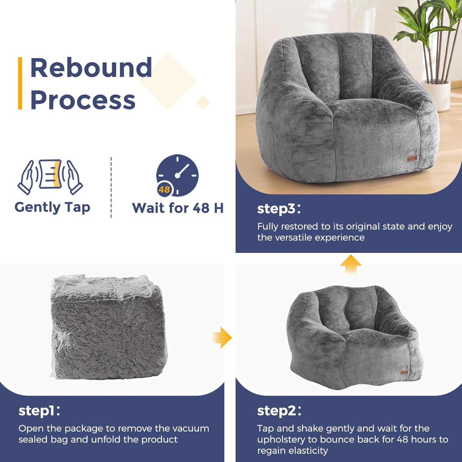 - Please Note: The bean bag chair is pre-filled, you do not need to fill it yourself. It is shipped compressed and needs time to rebound, tapped and shaken to promote recover speed, and waited about 48 hours to return to its original shape