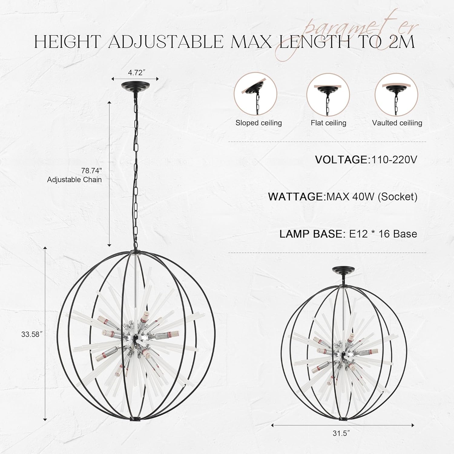 - 【Stylish Creative Design】The Black Chrome Sputnik Chandelier boasts a striking spherical body with Frosted Glass Tube design.It is not just a light for lighting, but also an art for decorating, looks like fireworks. Discover a world of exquisite illumination with our modern chandeliers, where contemporary meets vintage in perfect harmony.