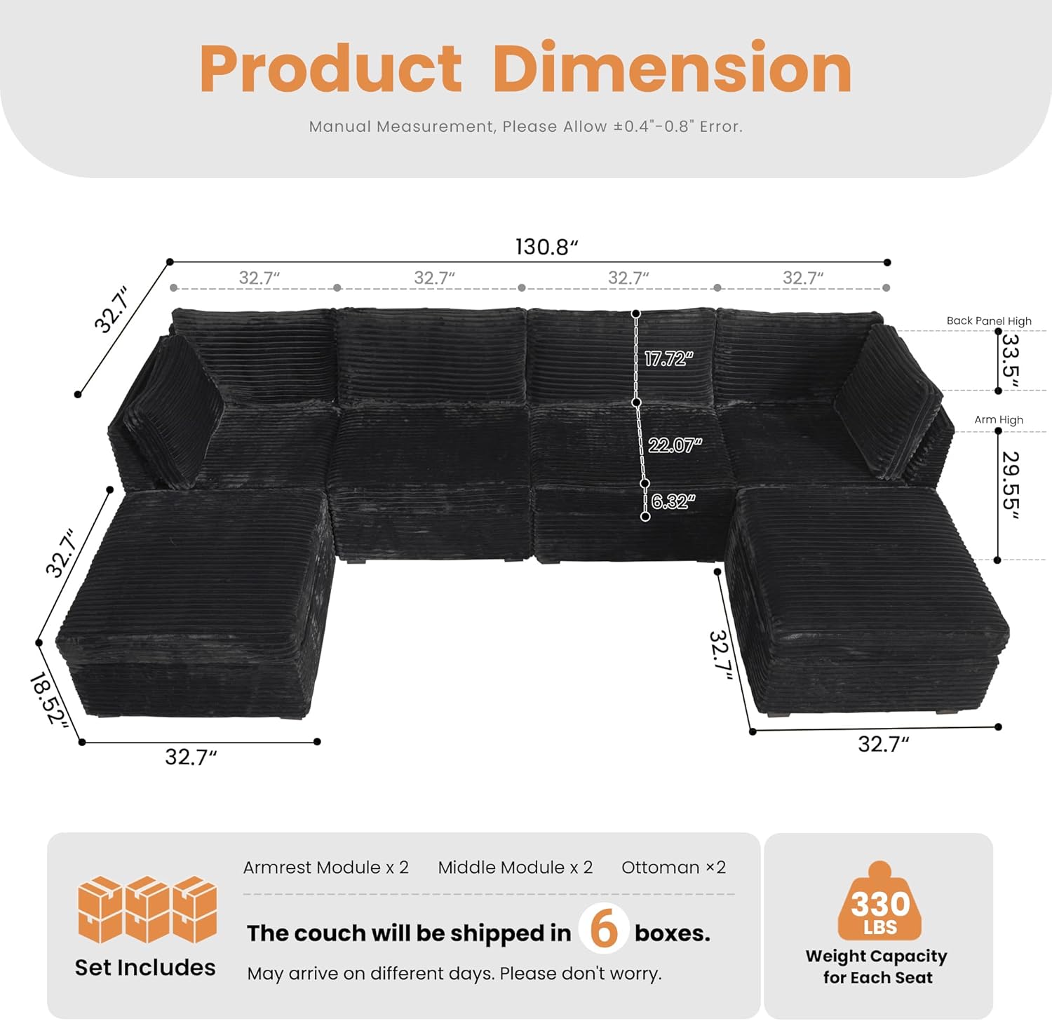 HOOOWOOO Modular Sectional Sofa,6 Pieces Sectional Couches for Living Room,131X66 L Shaped Cloud Couch with Ottoman Chaise Set(Black Velvet Corduroy)