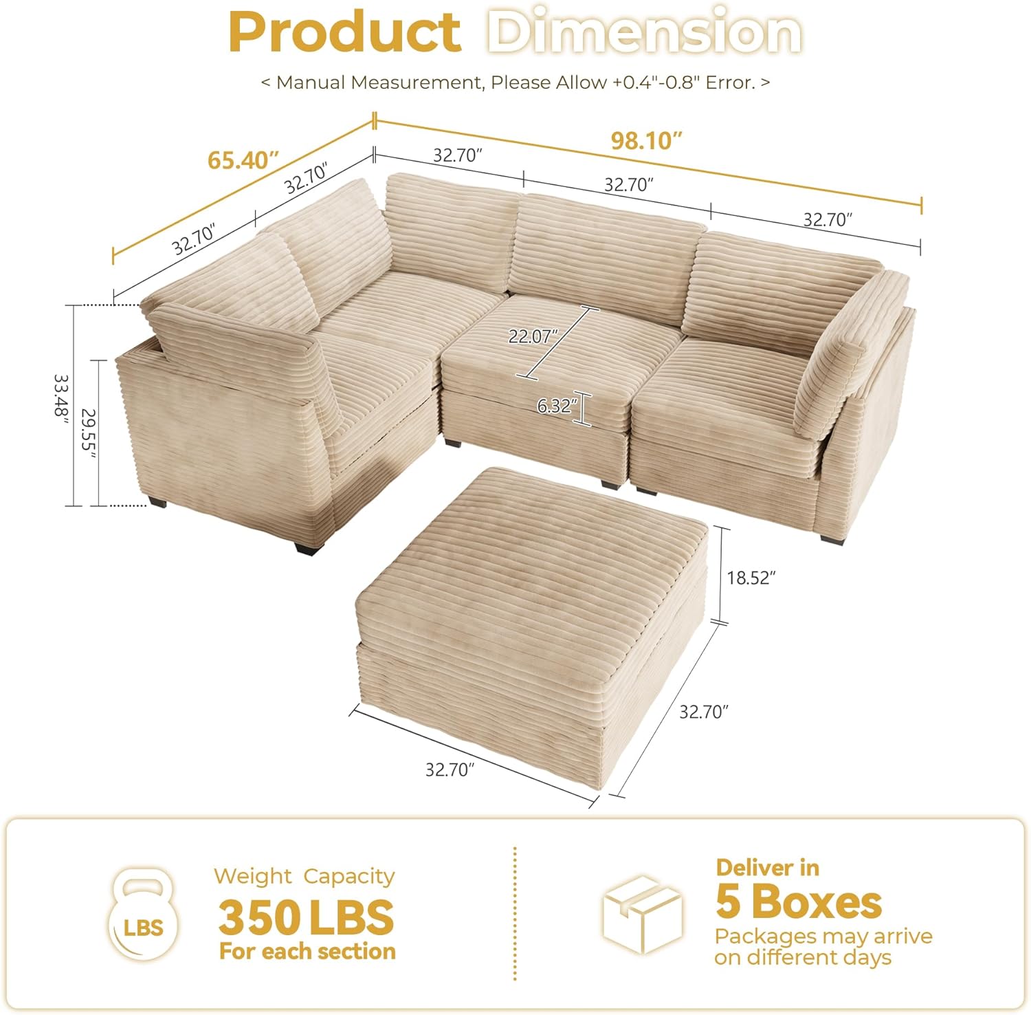 HOOOWOOO Modular Sectional Sofa,5 Pieces Sectional Couches for Living Room,98X66 L Shaped Cloud Couch with Ottoman Chaise Set(Beige Velvet Corduroy)