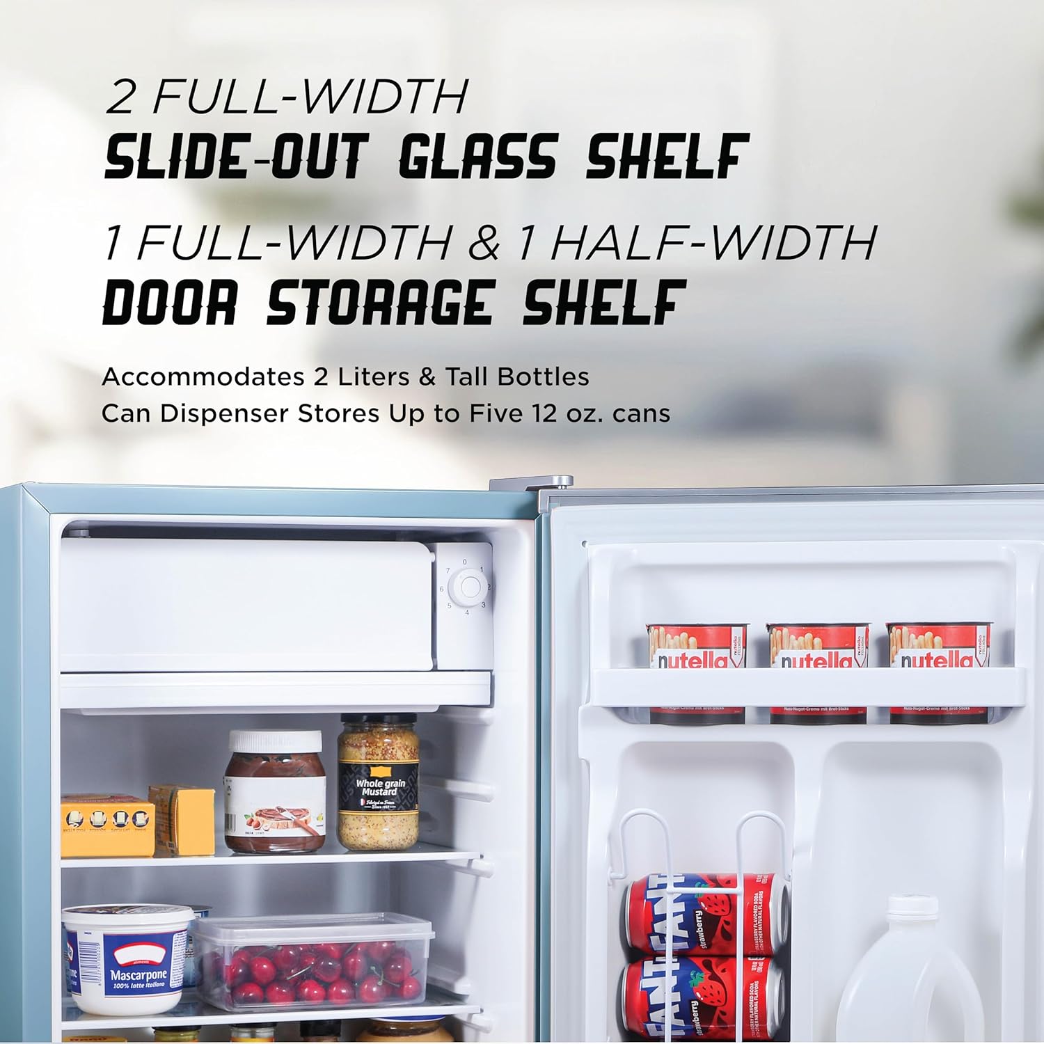 - Large Capacity: 2 removable glass refrigerator shelves help expand storage space while a full-width door storage shelf accommodates cans and small containers or 2-liter bottles
