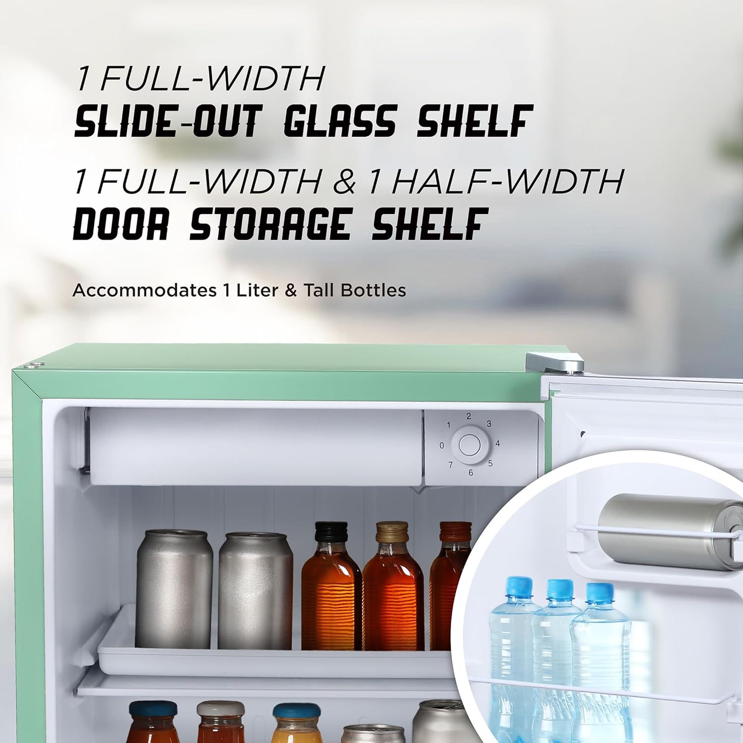 - Large Capacity: A removable glass refrigerator shelf helps expands storage space while a full and half-width door storage bin accommodates cans and small containers or 1-liter or taller bottles
