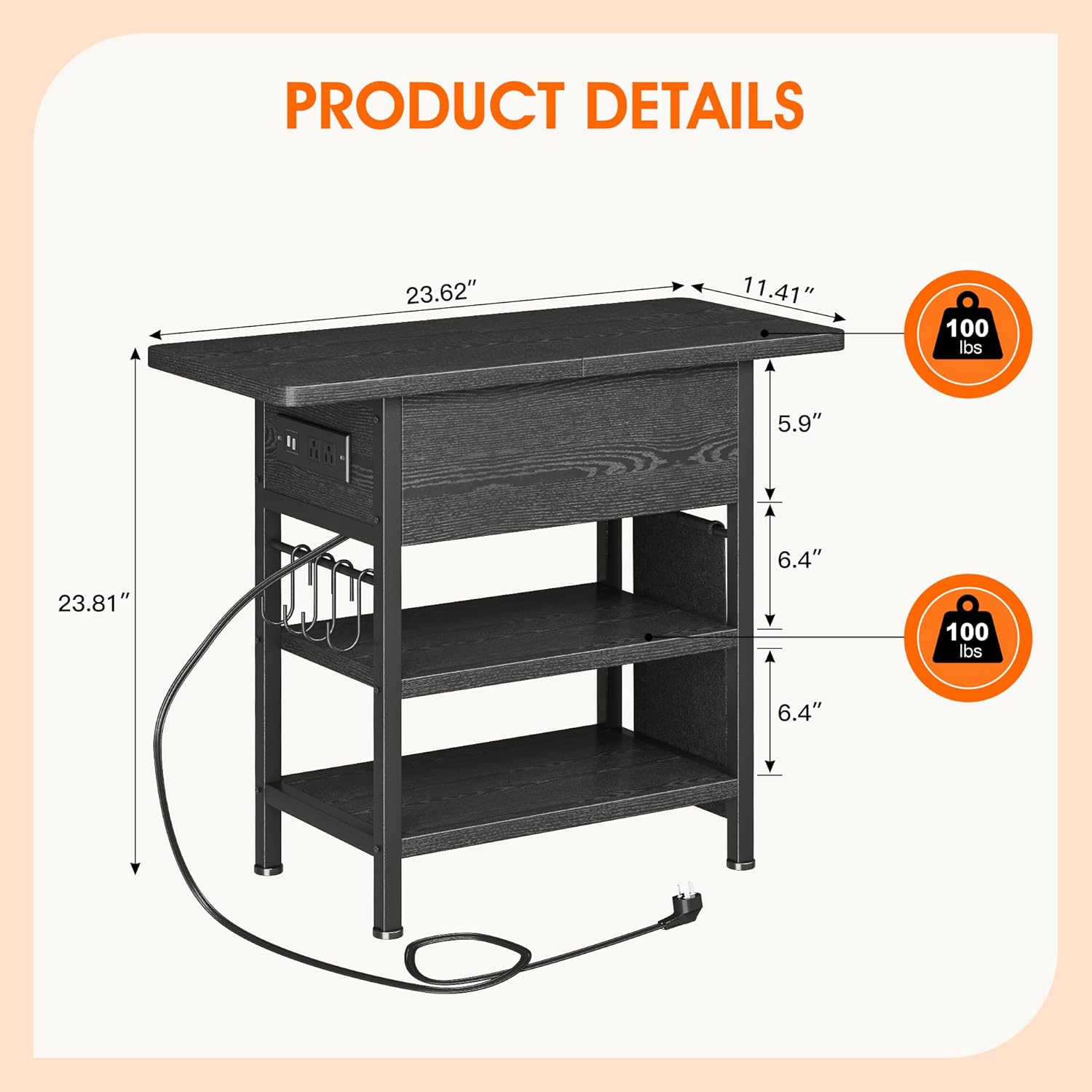 End Table with Charging Station, Flip Top Nightstand with USB Ports and Outlets,Couch Side Table with Fabric Bag and Hooks, Bedside Table for Space Saving, Living Room, Bedroom (Black)
