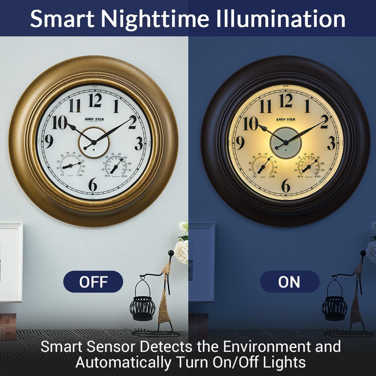 ANDY STAR 21 Inch Outdoor Clocks Waterproof, Large Outdoor Wall Clocks for Patio with Thermometer, Weatherproof Illuminated Clock Battery Operated with Thermometer&Hygrometer, Gold Metal Finish