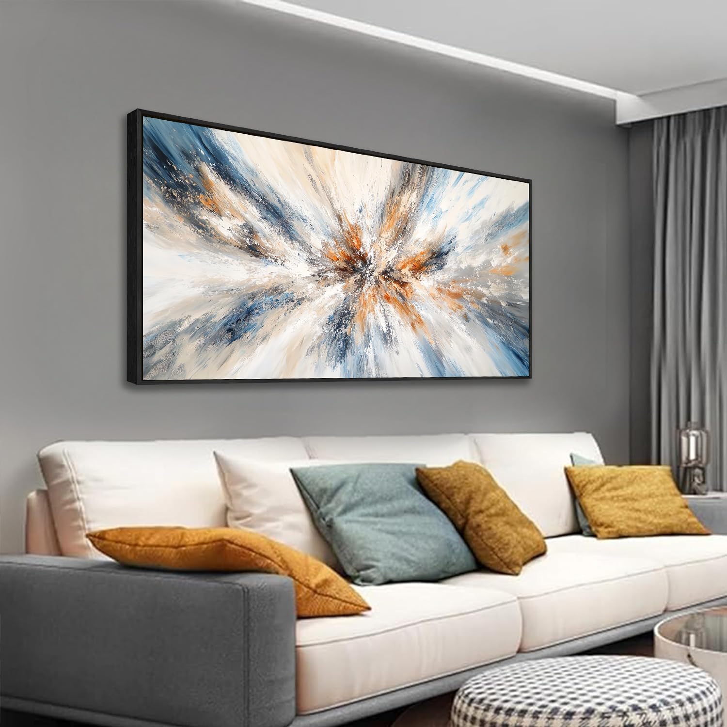 - Suitable Size for Livingroom Wall Decor: This framed canvas print showcases a captivating abstract artwork with dynamic brushstrokes in shades of blue, white, and orange. 30x48 inches (75x147cm)