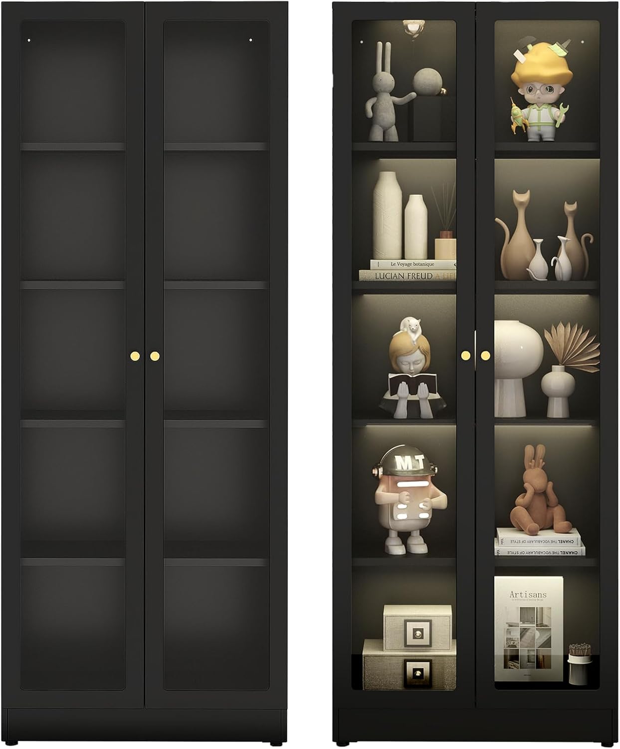 5 Tier Metal Curio Cabinets, Modern Bookshelf Cabinet with 4 Adjustable Shelves, Cabinet Display Case for Home Office, Living Room, Pantry (Black-27.5W)