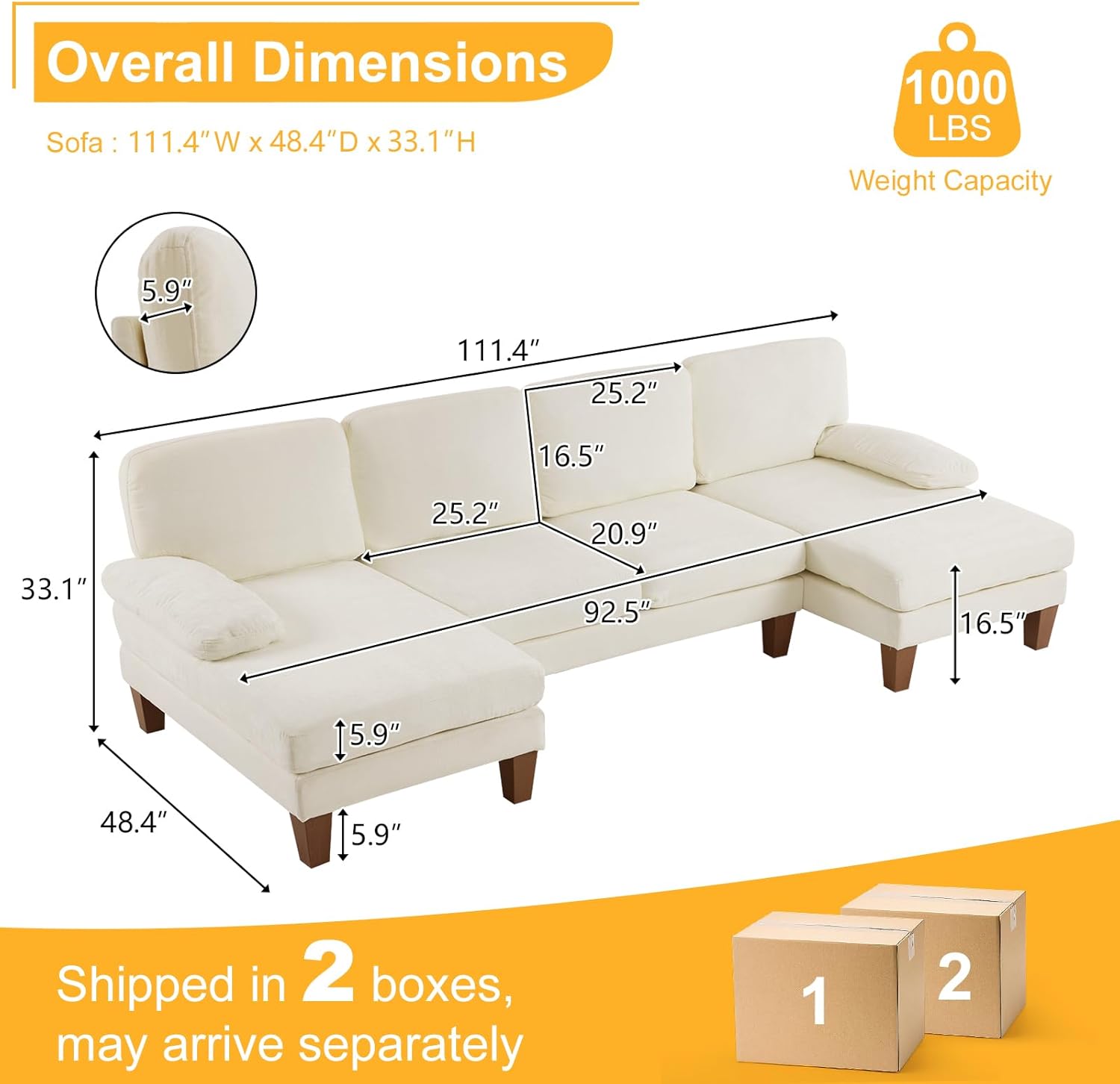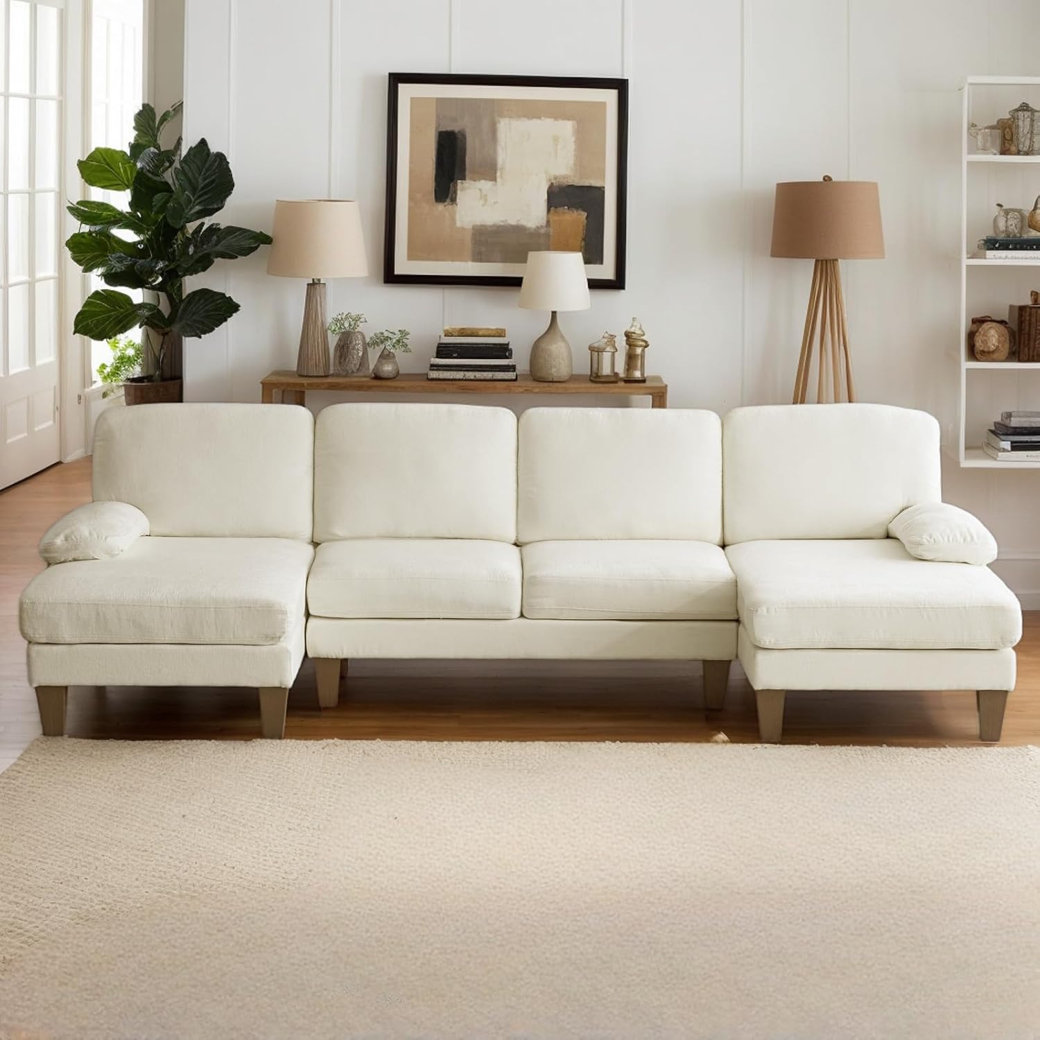 Karl home U-Shape Sectional Sofa Couch 111" Modern 4-Seat Sofa with Chaises Chenille Fabric Upholstered Covertible Couch with Wood Grain Legs for Living Room, Reception Room, Apartment, Beige