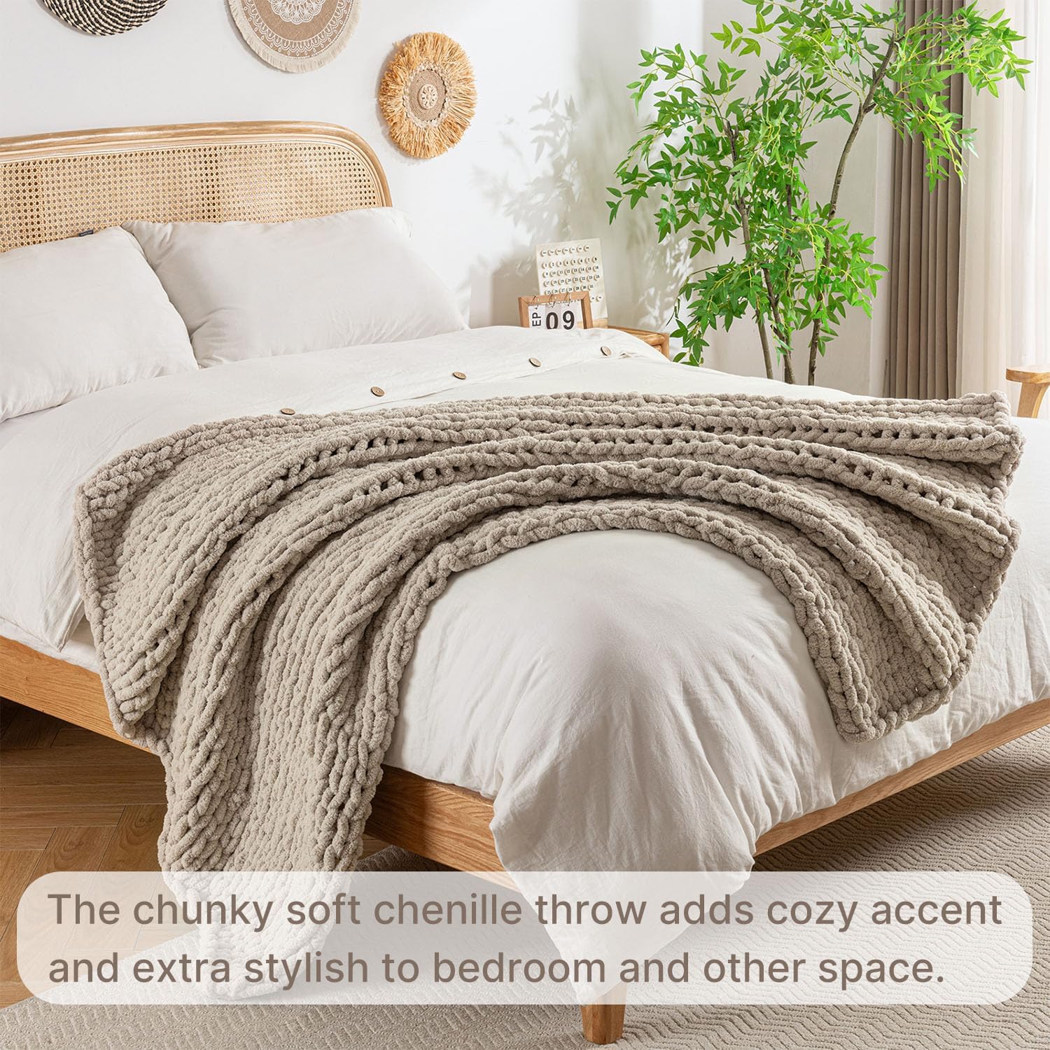 Chunky Knit Blanket Throw, 100% Hand Knit Throw Blanket Handmade Chenille Cable Knit Throw for Couch, Stylish Cozy Soft Rope Knot Crochet Blanket for Home Decor, Beige Linen, 40x50 Inches