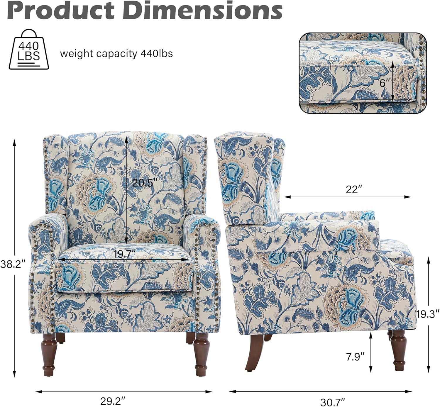 - Overall Product Dimension - 30.5"D x 29"W x 38"H. Seat Dimension: 22"D x 19.5"W x 19.2"H. Weight capacity: 400 lbs. The spaciousness creates a comfortable environment for resting or working. ATTENTION: Take the backrest Rigt Wing and Left Wing out from the bottom space of seat.