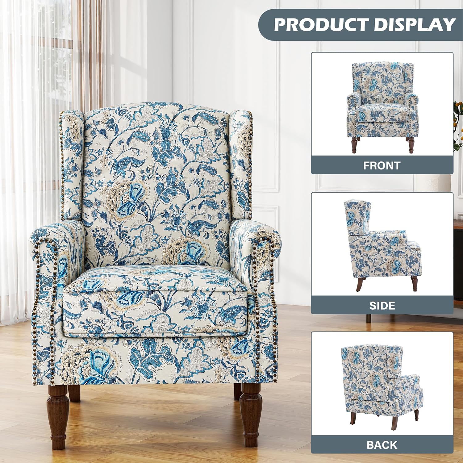 UIXE High Back Floral Accent Chairs Set of 2, Upholstered Armchair in Fabric, Retro Printed Wingback Arm Chair for Living Room, Nailhead Trim Single Sofa Bedroom Reading Seat - Boho Blue