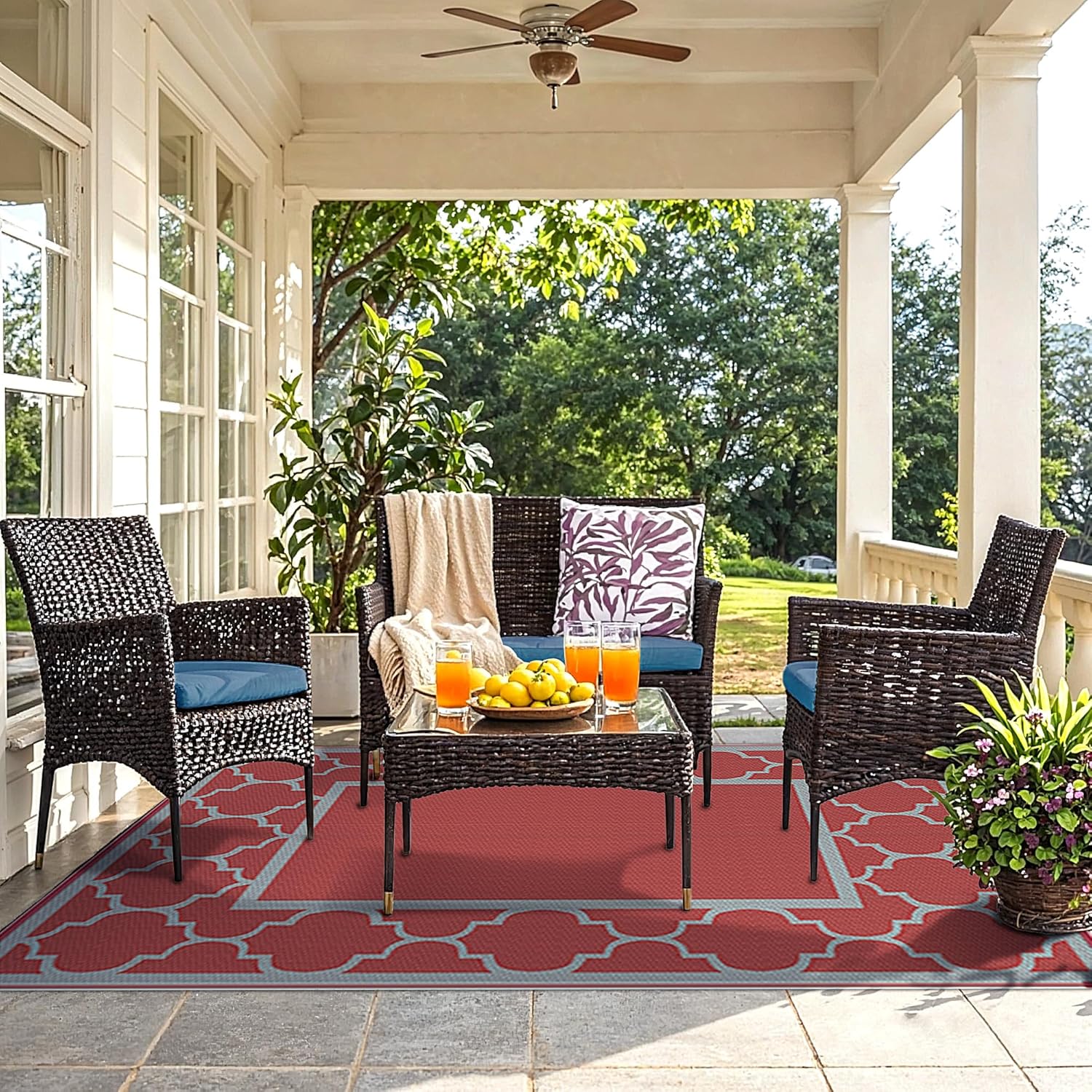 - Mood-Boosting Colors:Choose stain-resistant dark tones or go modern with blue & white or black. The reversible mat, with outdoor carpet qualities, is easy to clean and coordinates seamlessly with various decors. Whether placed on your deck or under a shaded umbrella, it serves as the perfect outdoor patio rug to match the style of your pamapic outdoor furniture.It’s an excellent piece for fall home decor or to use as a stylish outdoor rug fall accent