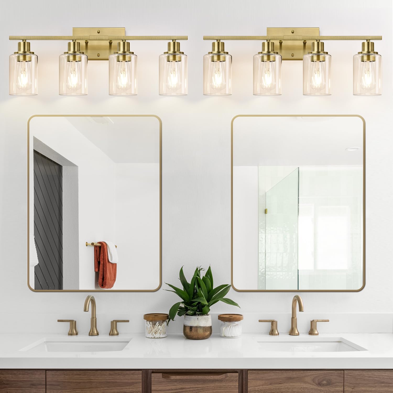 4 Light Bathroom Light Fixtures, Brass Vanity Lights for Bathroom with Clear Glass Shades, Modern Bathroom Wall Sconces for Mirror Living Room Cabinet