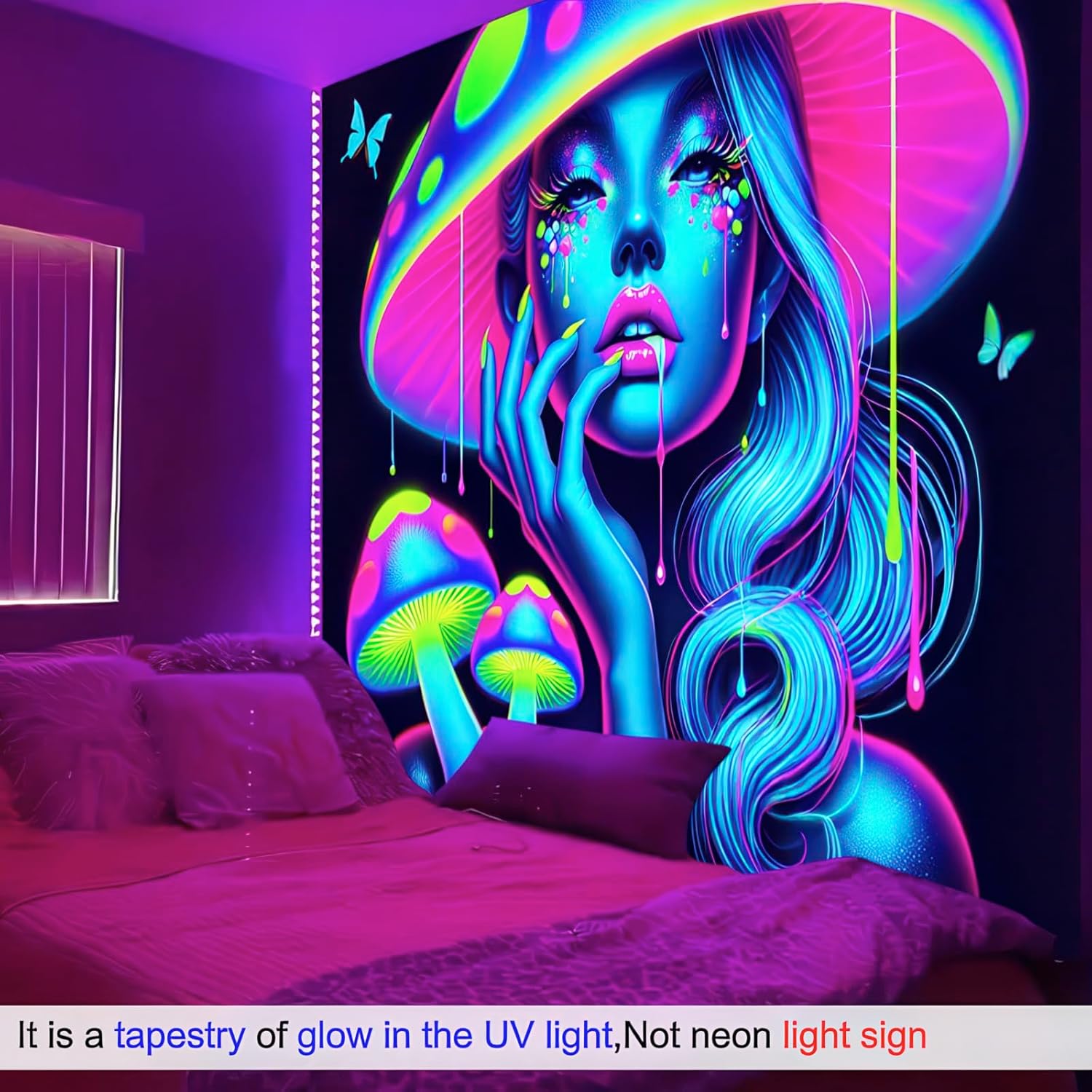 - Striking Psychedelic Design: Featuring a mesmerizing mushroom goddess with vibrant neon colors that glow under UV blacklight, this tapestry brings an ethereal and artistic vibe to any space, perfect for bedrooms, festivals, or creative events.