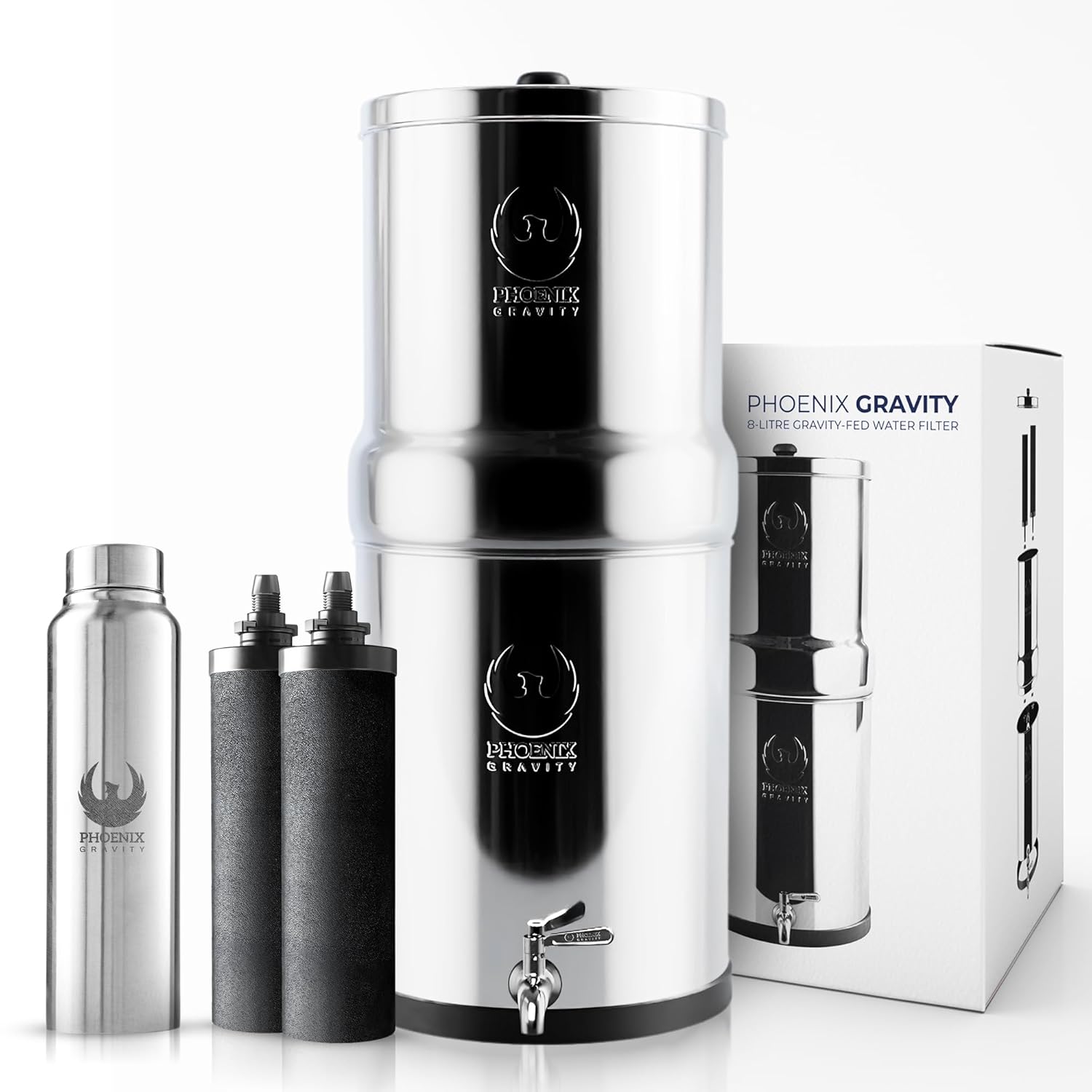 - 𝐀𝐥𝐥-𝐈𝐧-𝐎𝐧𝐞 𝐒𝐨𝐥𝐮𝐭𝐢𝐨𝐧 – The Phoenix Water Filter System includes a stainless steel tank, 2 Smart Carbon (Black) filter elements, a stainless steel spigot, and all required parts. Whether you need a countertop water filter system for your kitchen or a portable water filter for on-the-go use, it’s ready right out of the box.