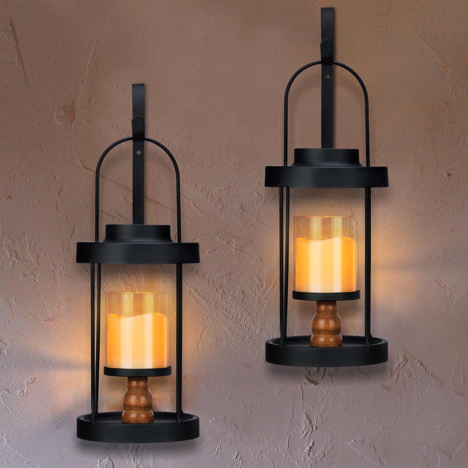Metal Wall Sconce Candle Lantern Set of 2 - Black Wall Mounted Wood and Metal Hanging Holder with Glass & Candles Vintage Wall Decor for Porch, Living Room, Dining Room, Bedroom Indoor Decor
