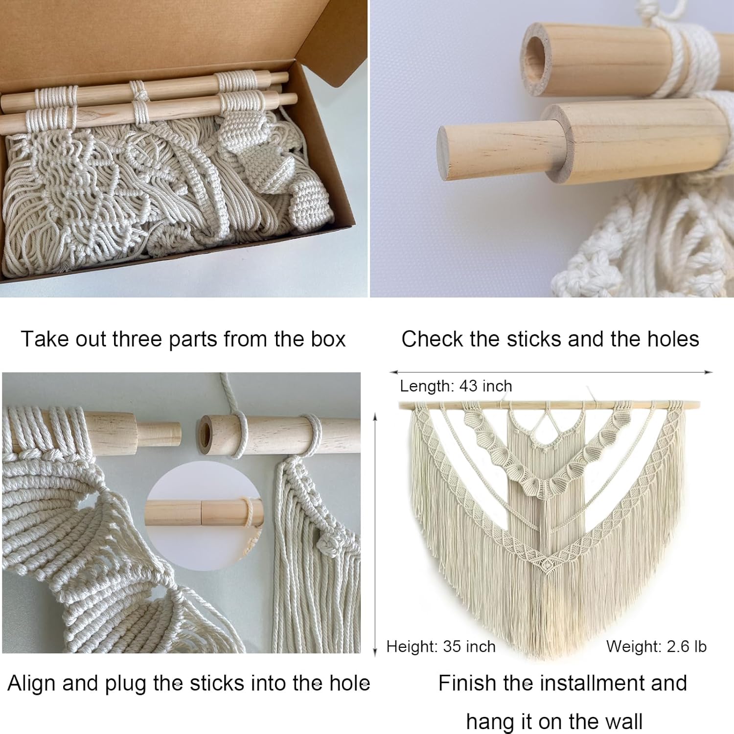 - Easy to Install: The package comes with 3 separate parts of short macrame wall hangings which could be easily connected together with the screws inserted in the wood rod.