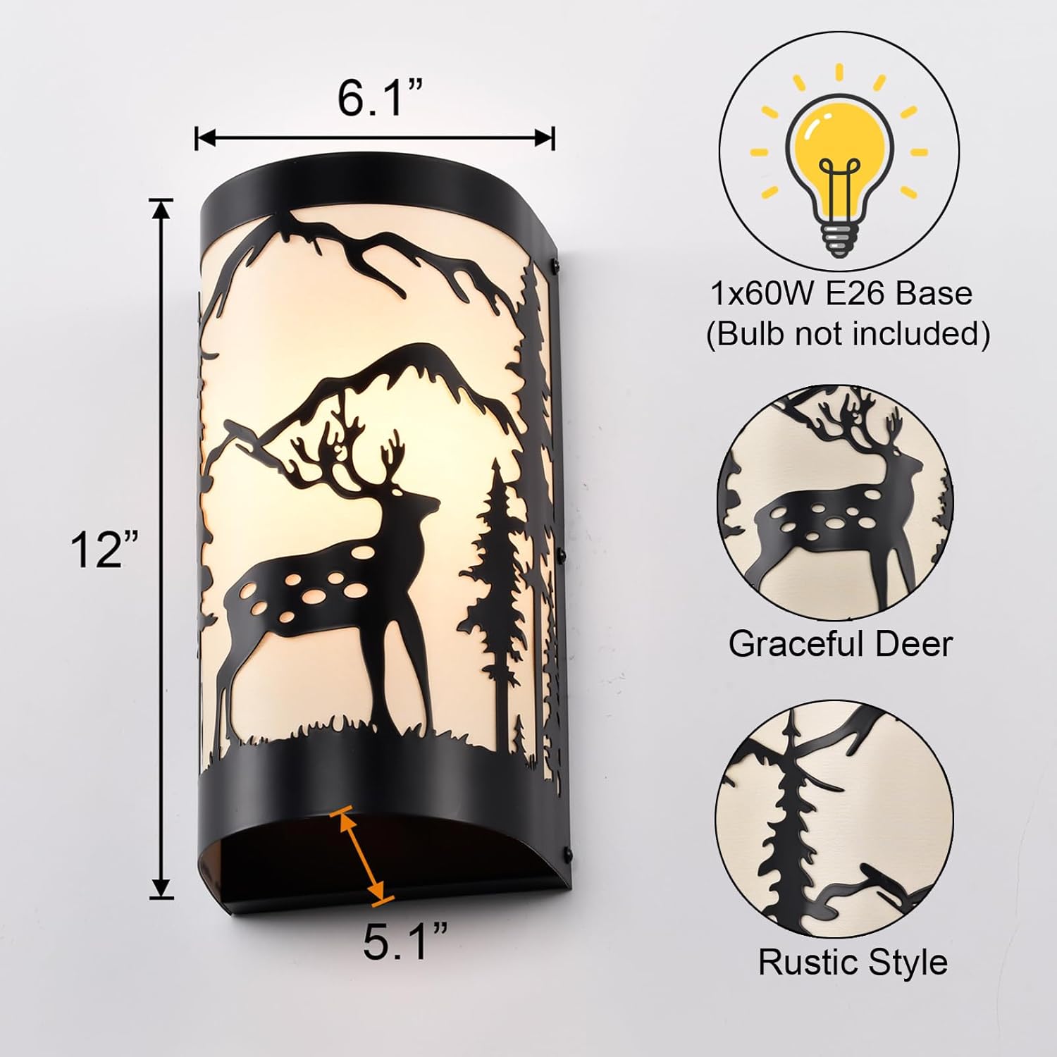 Black Wall Sconces Set of Two,Deer Metal Cream Parchment Rustic Wall Sconces,Farmhouse Indoor Wall Light Fixtures,Industrial Matte Sconce Light,Wall Lamps for Bedroom,Living Room,Hallway