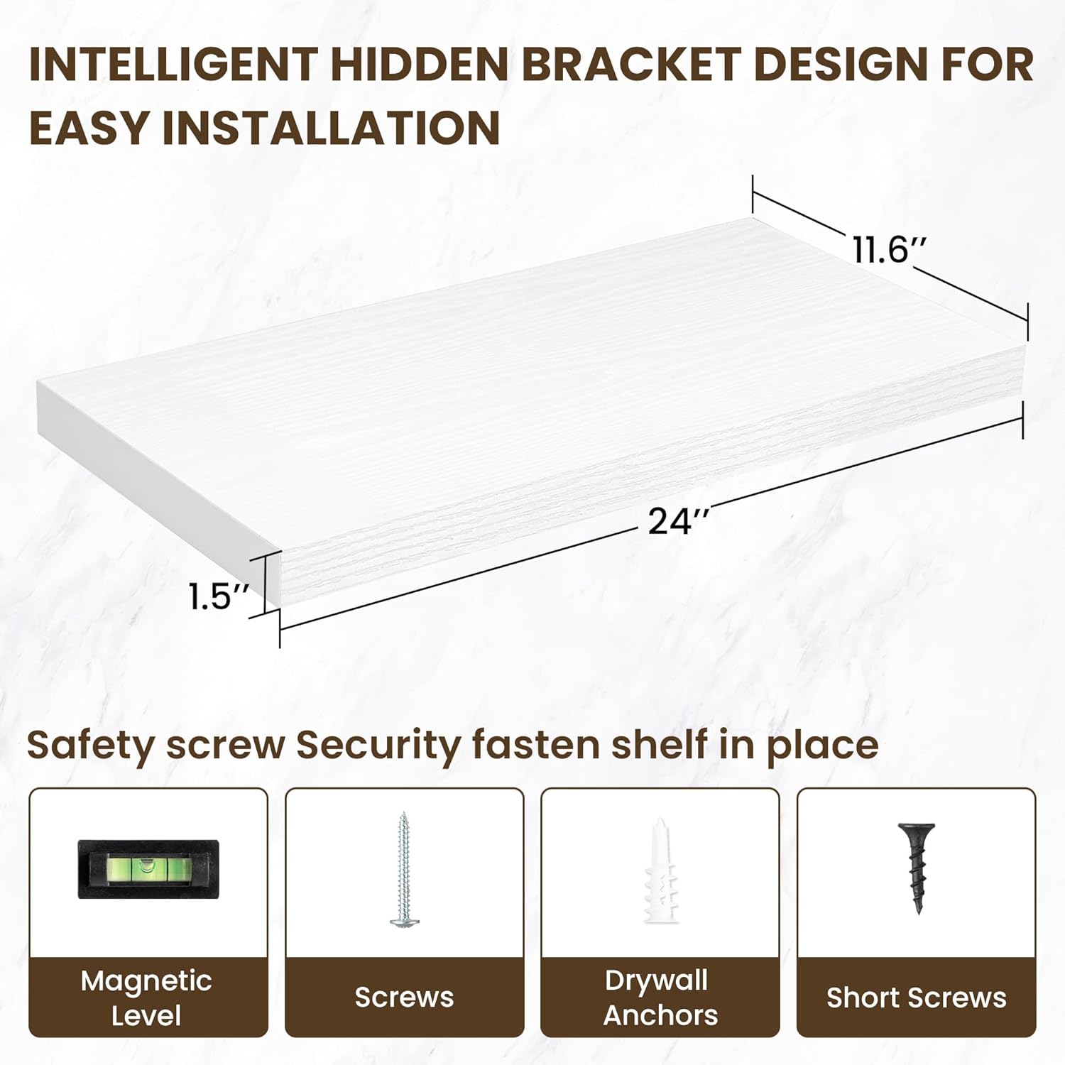 24 Inch Floating Shelves, 12 Inch Deep Floating Shelves for Wall, Floating Shelf with Invisible Brackets, Deep Shelves for Bathroom, Bedroom, Living Room, 2 Pack, White
