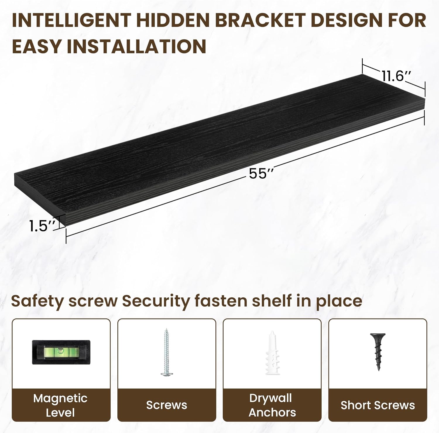 55 Inch Floating Shelves, 12 Inch Deep Floating Shelves for Wall, Floating Shelf with Invisible Brackets, Deep Shelves for Bathroom, Bedroom, Living Room, 1 Pack, Black