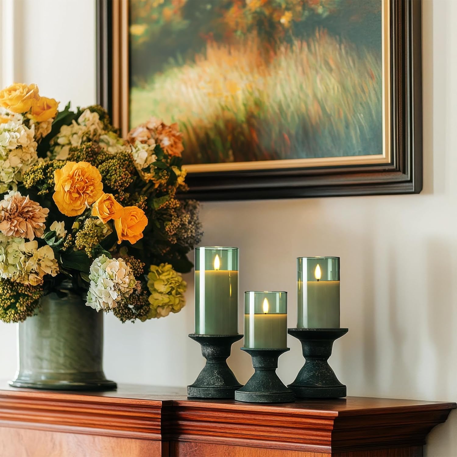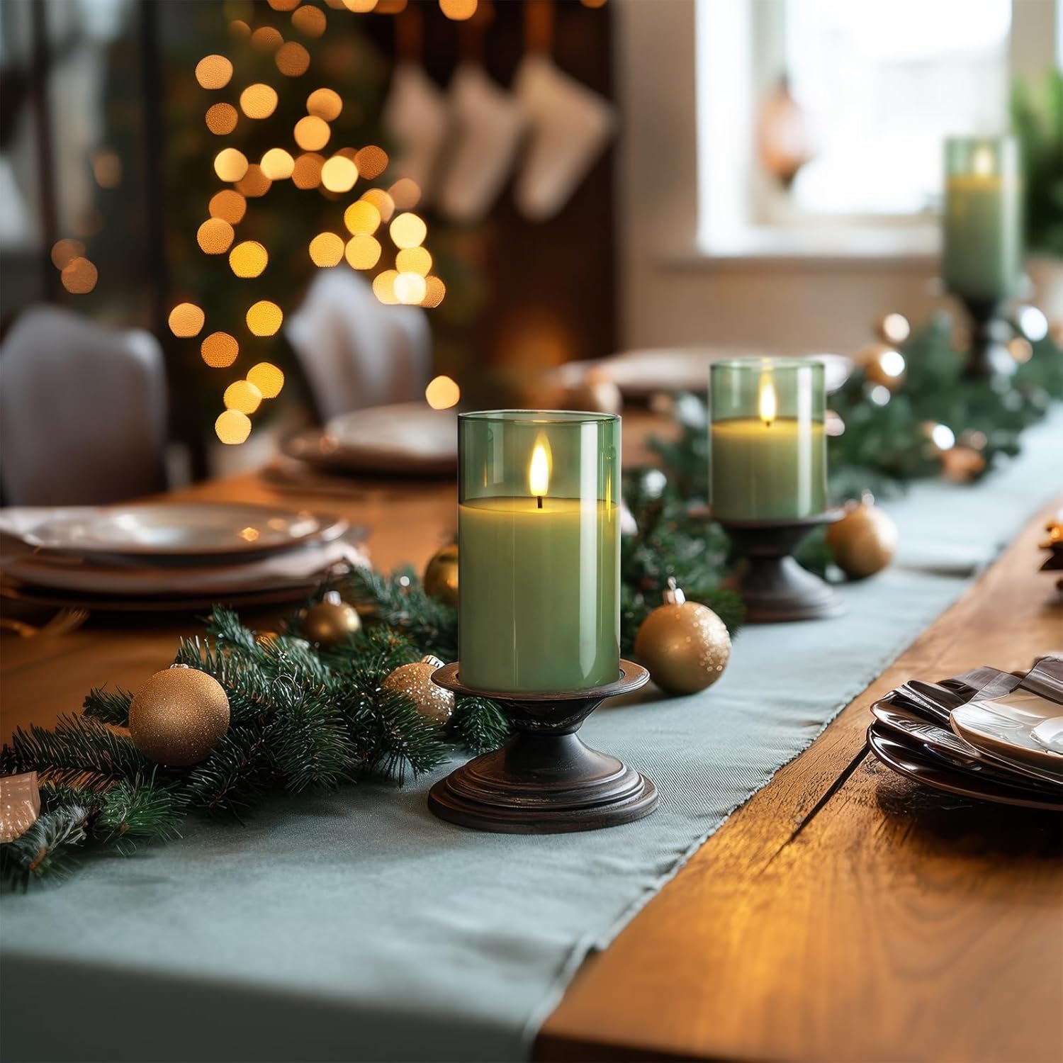 Amagic Green Glass Flameless Candles with Remote and Timer, Real Wax Battery Operated Candles, Flickering Electric LED Pillar Candles for St. Patrick's Day, Christmas Party Decor, Set of 3