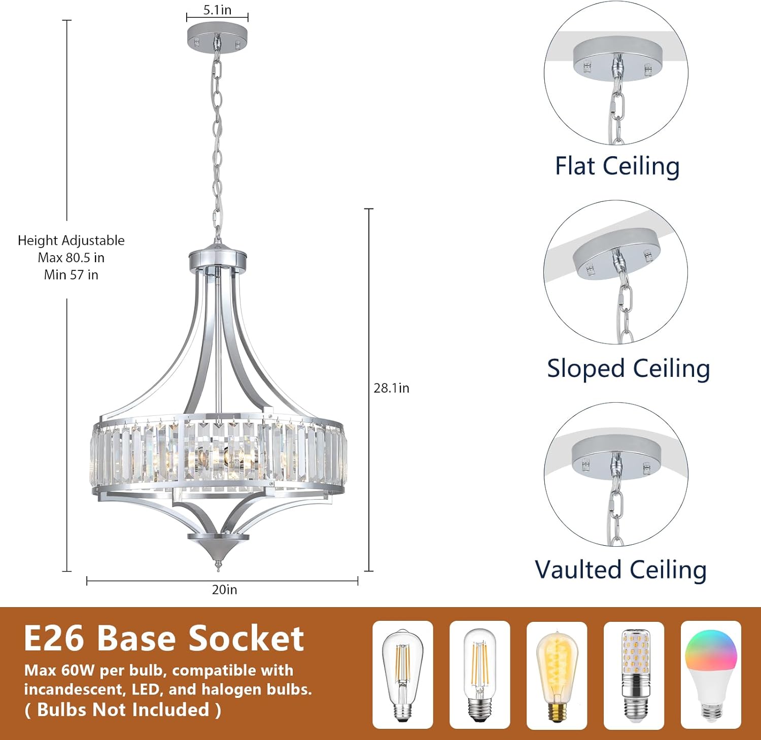- 【𝐄𝟐𝟔 𝐁𝐚𝐬𝐞 𝐂𝐨𝐦𝐩𝐚𝐭𝐢𝐛𝐥𝐞 𝐟𝐨𝐫 𝐌𝐨𝐬𝐭 𝐁𝐮𝐥𝐛】Modern chandelier supports LED (energy-saving), CFL (bright), halogen (warm glow), or RGB bulbs (color-changing moods). 𝐁𝐮𝐥𝐛𝐬 𝐍𝐨𝐭 𝐈𝐧𝐥𝐜𝐮𝐝𝐞𝐝—pair with dimmable options for adjustable brightness. Easy bulb replacement via accessible socket design. Use your preferred lighting style!