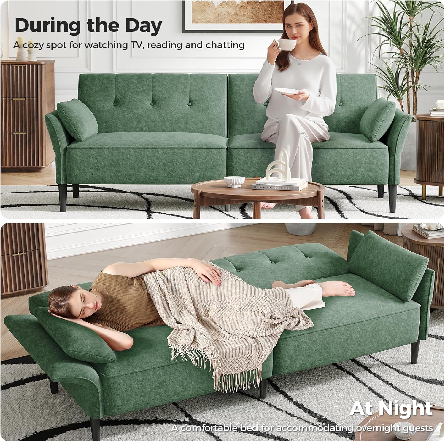 - 【Four-position Adjustable Armrests】Designed in popular styles, this convertible sofa bed is a perfect blend of style and durability. The armrests on both sides can be deployed outward for maximum side lying area, and the maximum deployment angle can be up to 90°. Meanwhile, with the two soft report pillows provided, you can place the pillows at the cervical vertebrae and lumbar region to effectively relieve fatigue