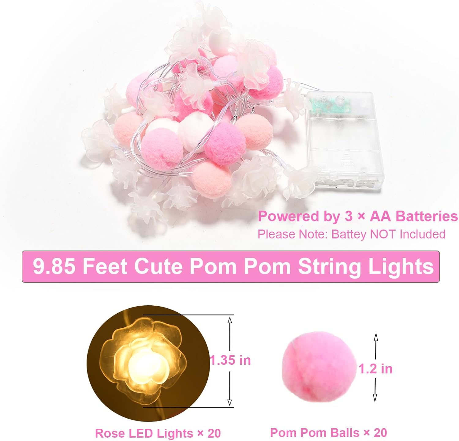 - UNIQUE POMPOMS FLOWER STRING LIGHTS: Our 9.85 feet decorative string lights with 20 soft cute pompoms balls and 20 LEDs beautiful rose flower shaped warm white fairy lights. Each LED bulbs equipped with a transparent rose flower, combined with the cute pink pompoms garland, glow warm and lovely ambiance, create a novelty and soft lighting decoration for bedroom