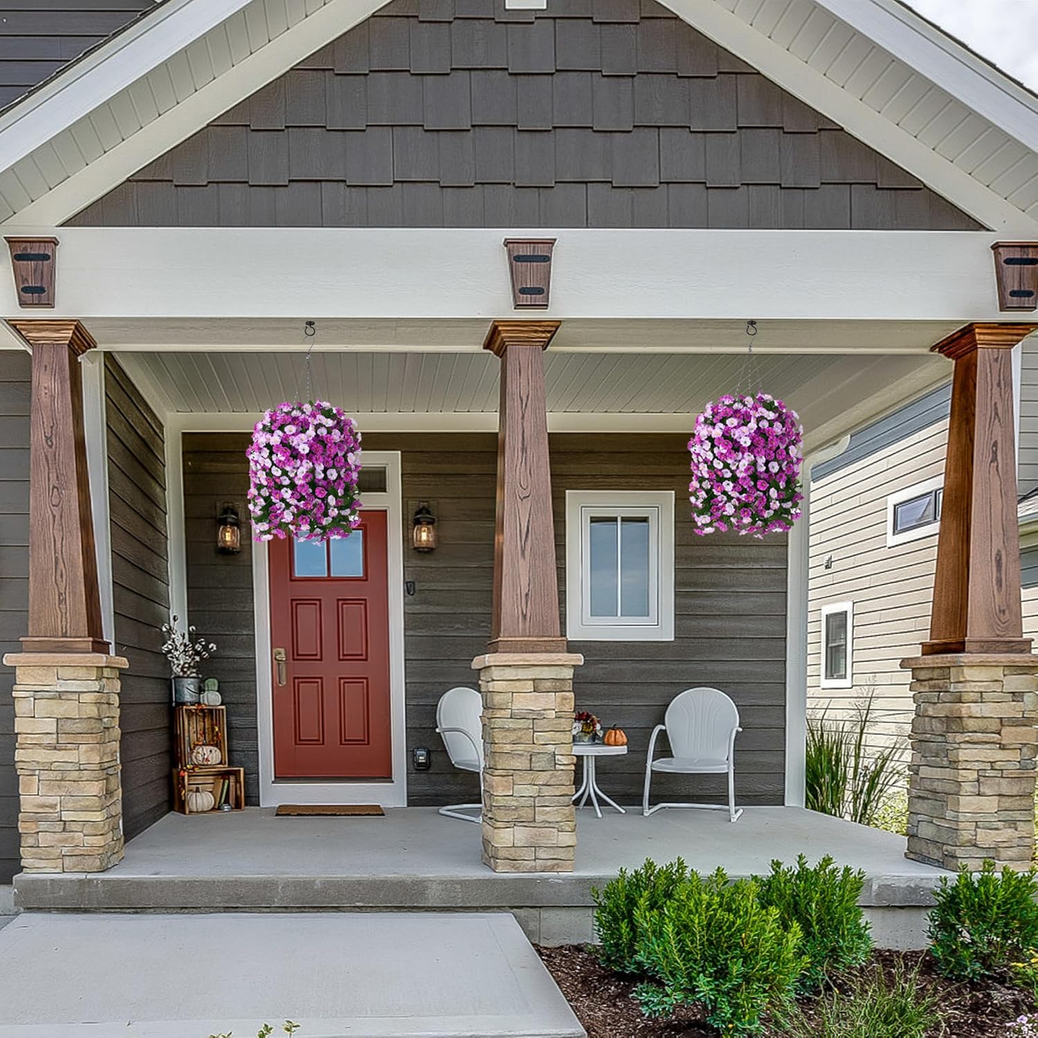 - GOOD QUALITY: The hanging basket and artificial flowers were made of good quality material that don’t require maintenance after assembly. It’s UV resistance and won’t fade, sturdy enough for any weather. No watering needs.