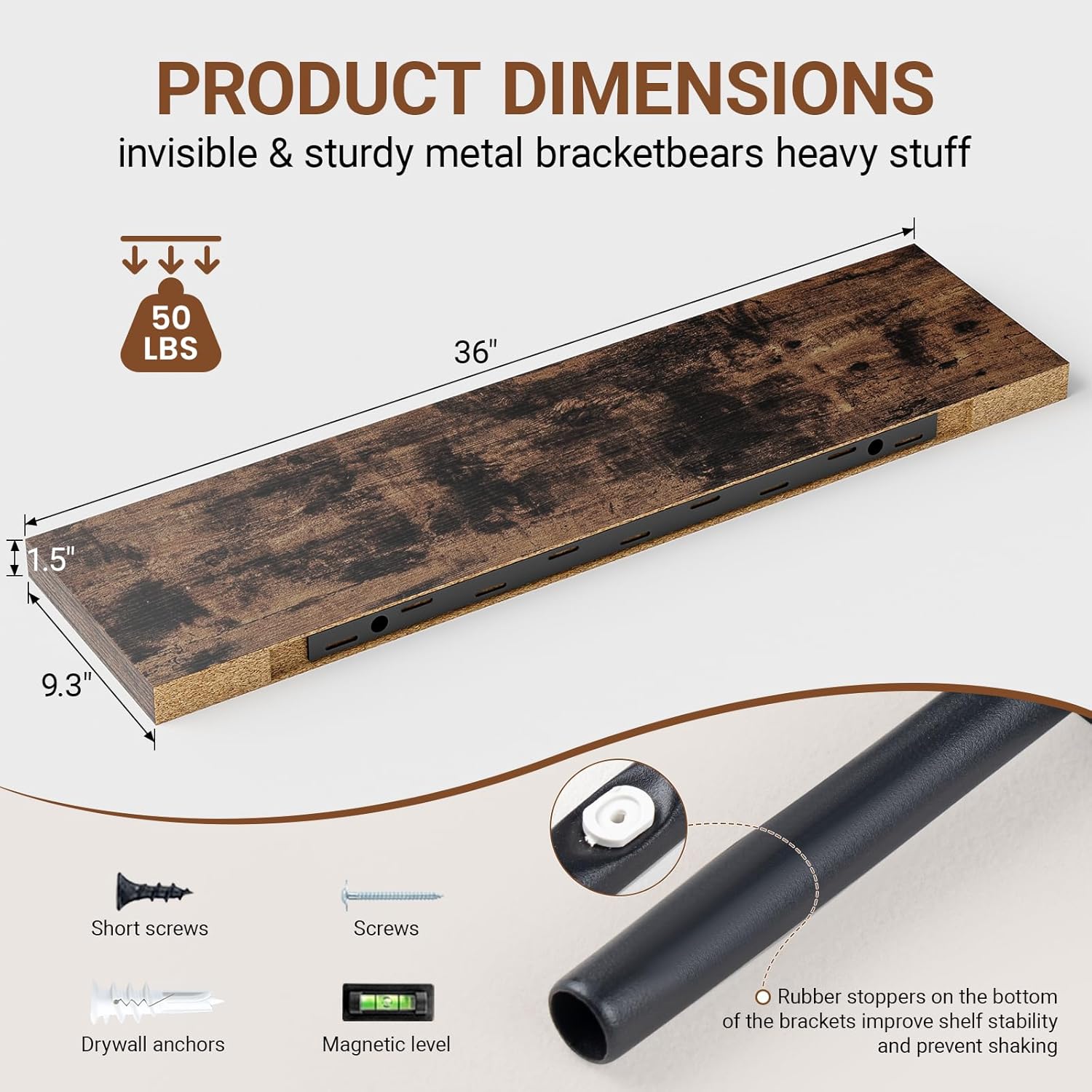 - 【Sturdy & Reliable Material】The brown floating shelves use metal brackets and screws to be firmly fixed to the wall without sagging.Our rustic brown floating shelves 36 inch are made of high quality MDF material,can hold up to 50 lbs to safely place your items.