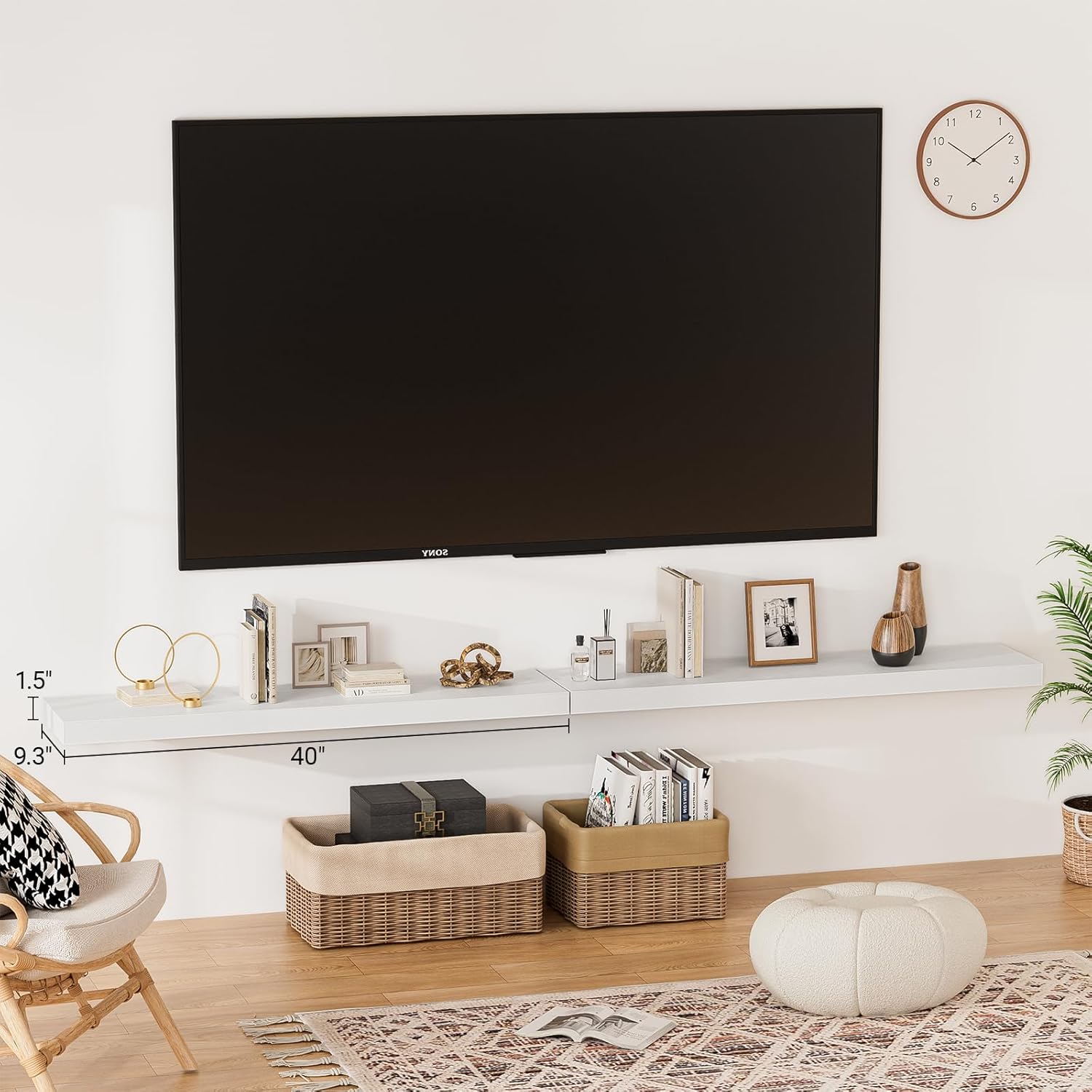 - 【Longer Design】Our pretty white wall shelves are 40"W x 9.3"D x 1.5"H.Our white floating shelves is longer than traditional designs and can hold more items.The white floating shelf optimize wall space,helping organize essentials without taking up floor space in your home.