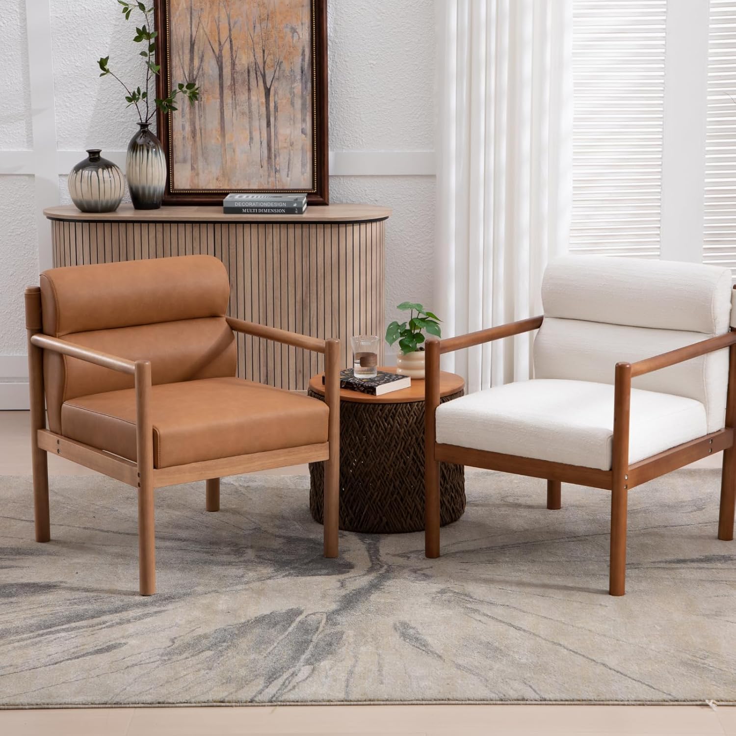 - MID CENTURY MODERN STYLE: Our Wood accent chairs combine style and function, their unique silhouette, channel-tufted back and sturdy wood frame, are full of a mid century vibe, and naturally classic. brown wooden structure and brown faux leather upholstery padding give us a sense of peace and relaxing, and the wood finish is very smooth and soft to the touch. Two colors can be selected to add a mid century atmosphere to your room