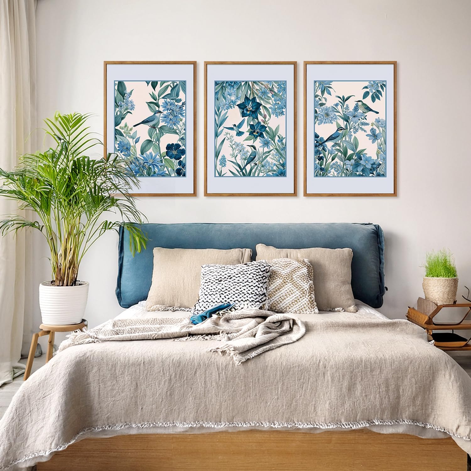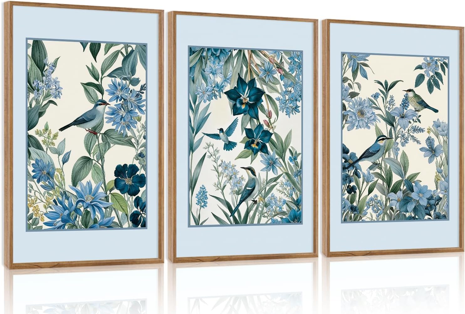 - Blue Birds and Botanical Wall Decor-- Aurlan framed birds canvas artwork is a 3-piece wall art of birds on botanical. Each painting predominantly features blue and white tones, with a unified style and harmonious color coordination, making them suitable for decorating interior spaces.