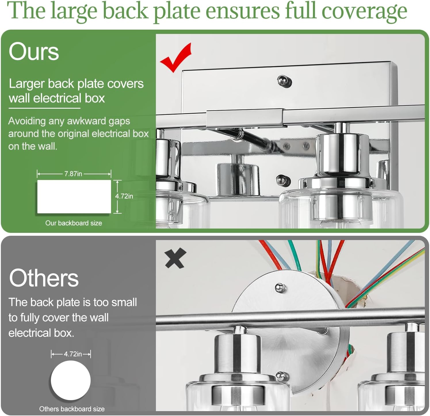 - Upgraded Chrome Finish - The vanity lighting fixtures feature a sleek chrome finish lamp body accompanied by clear glass shades. The upgraded finish not only adds an elegant touch but also includes a scratch and tarnish-resistant coating, ensuring that the bathroom light maintains its pristine appearance over time