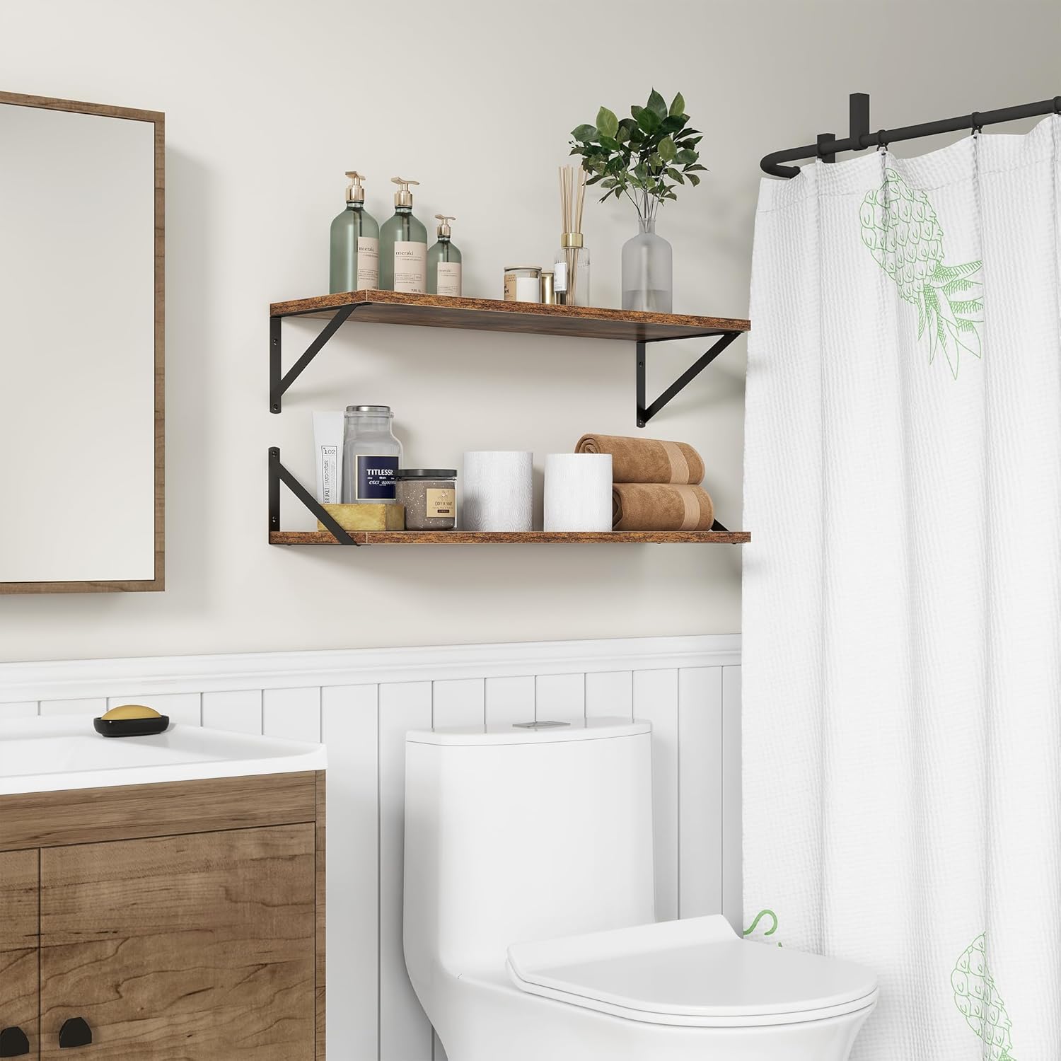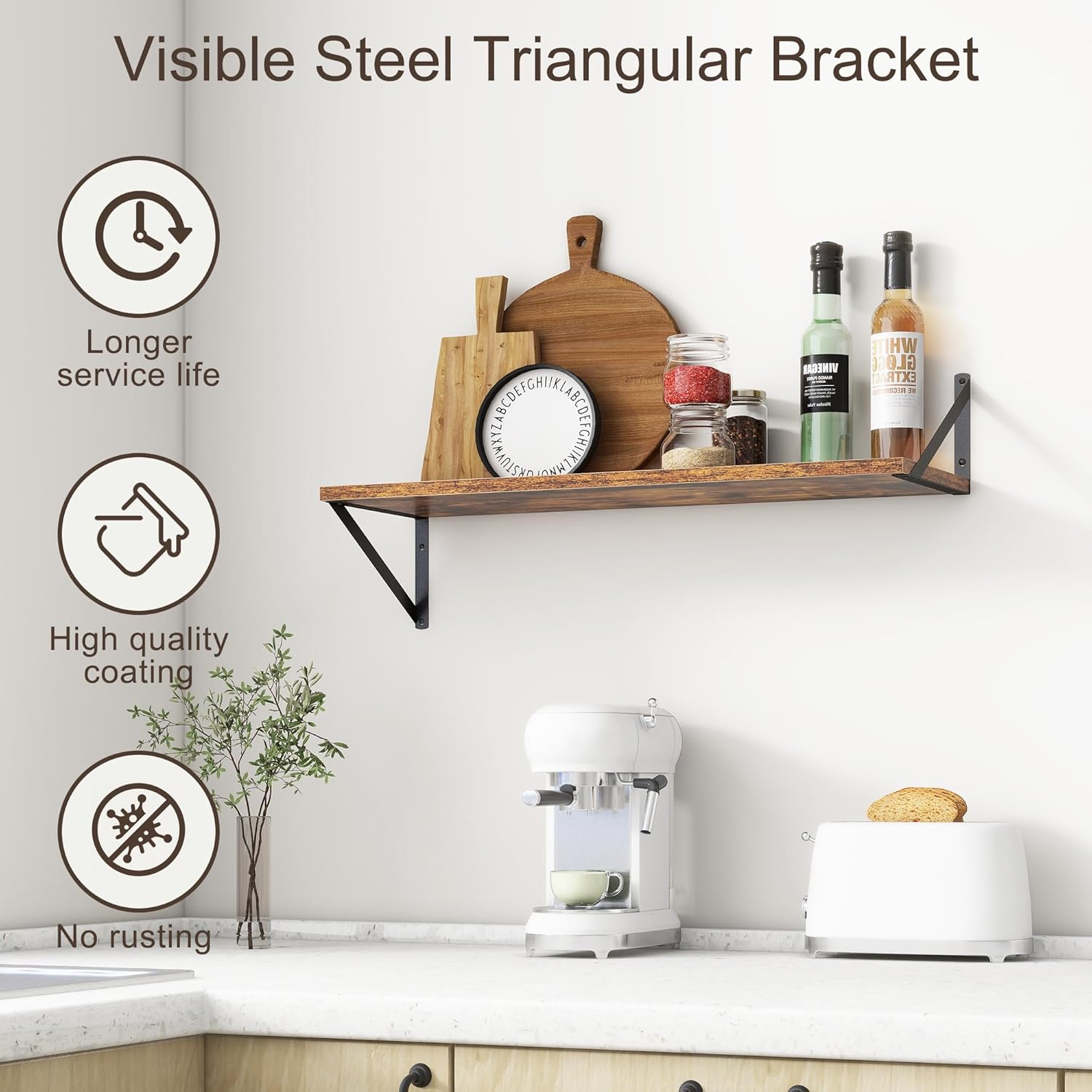 - ăFARMHOUSE RUSTIC WALL SHELFăThese floating shelves are made of premium engineered wood board and visible triangular bracket. The rustic wooden grain surface add character and warmth to any modern or traditional interior with these deep floating shelves, contrast shelves at staggering heights on the wall or mount side-by-side or in the corner for a clean streamlined look.