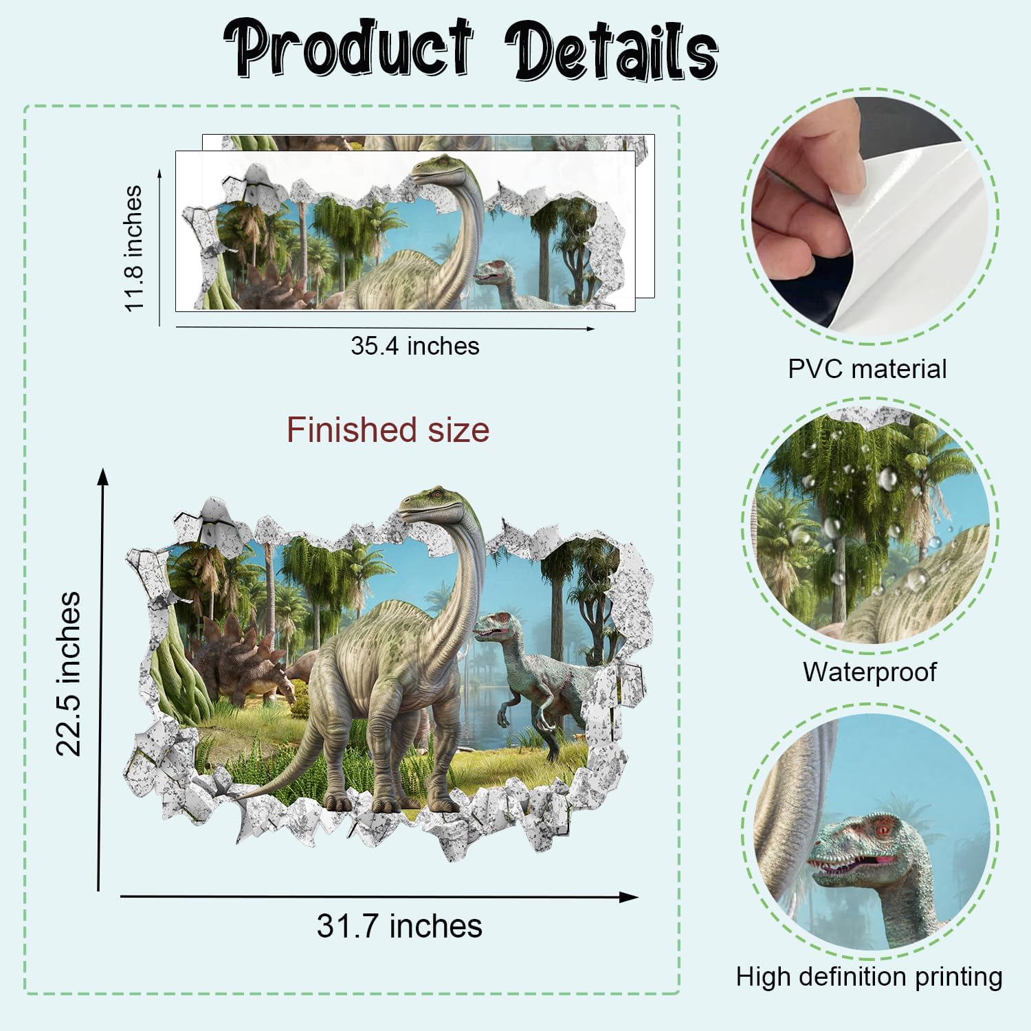 Large 3D Dinosaur Wall Stickers (31.7”x 22.5”), Dino Broken Hole Vinyl Wall Decals, Removable Forest Dinosaur Animal Wall Art for Kids Boys Bedroom Playroom Decor