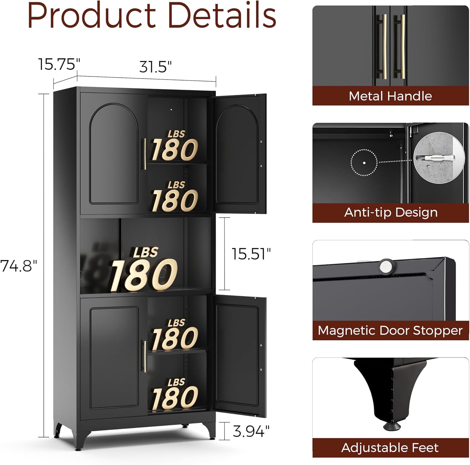 - 【Practical Design】The unique line design of the pantry doors with gold handles adds highlights to your dining area. Black cabinet with doors is equipped with anti-tipping devices that can be mounted on the wall to prevent tilting or rollover