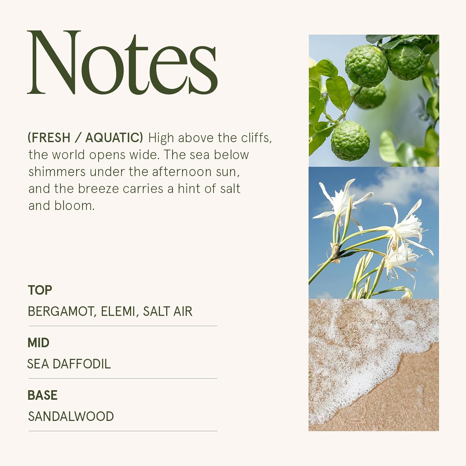 - SANTORINI SALT AIR: A refreshing fragrance that opens with bright mandarin, bergamot, elemi, and salt air, transitions into a floral heart of sea daffodil, muguet, and rose, and finishes with the warm, woody notes of cedarwood, tuberose, and sandalwood