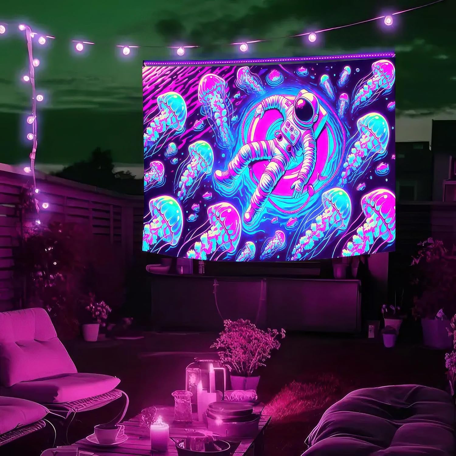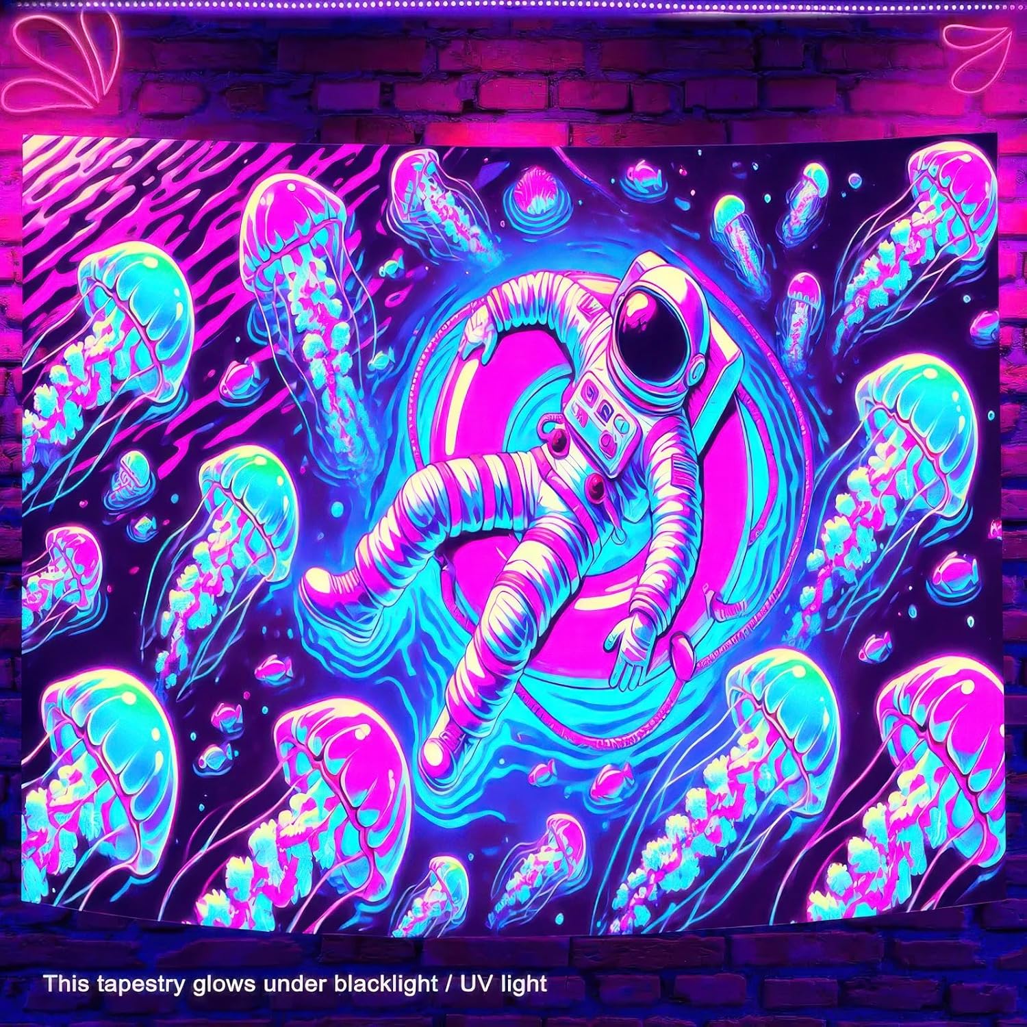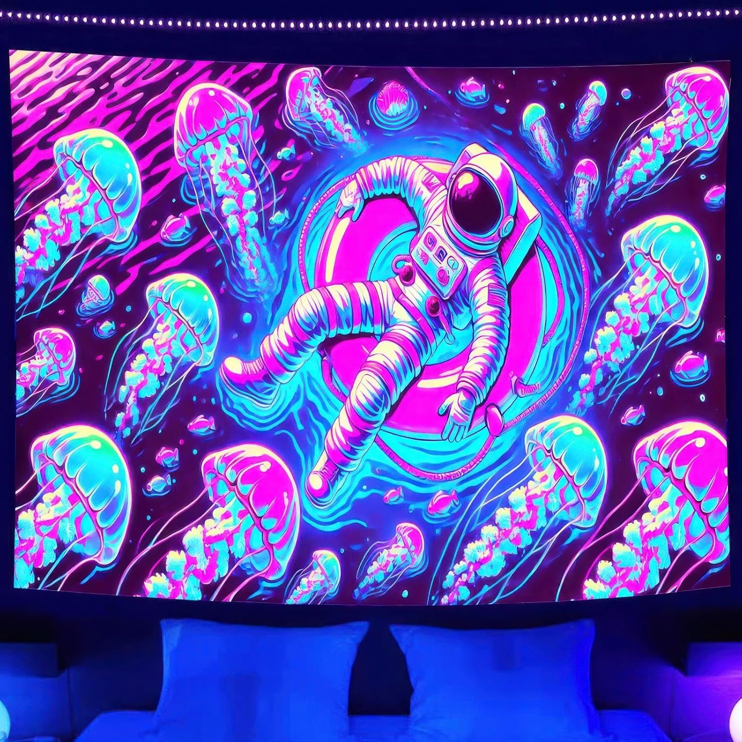 BlissYard Blacklight Tapestry Uv Reactive Tapestry Glow Tapestry 78x59 Inches Wall Tapestry Astronaut Jellyfish in Space Fluorescent Wall Hanging Neon Art Decor with Cosmic Jellyfish and Space Theme