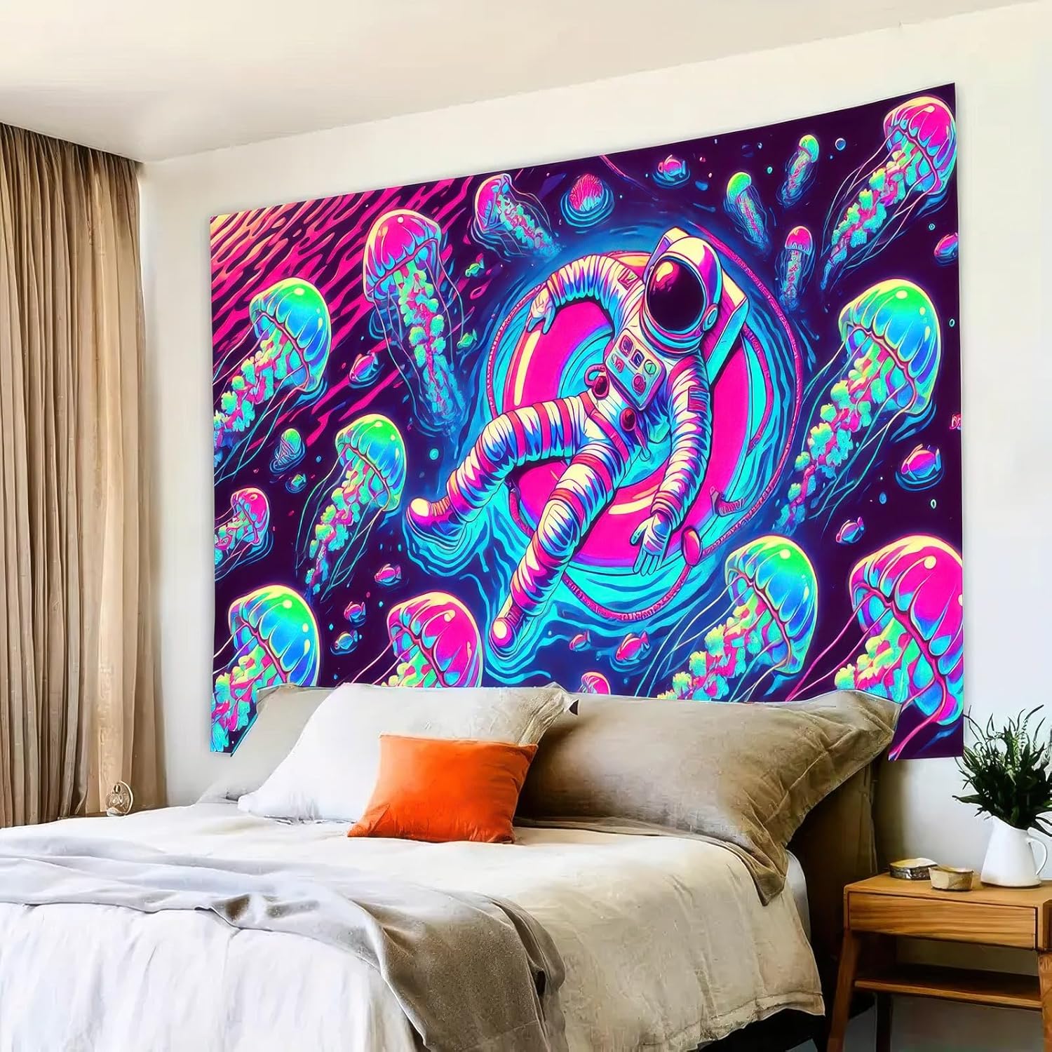 - Whimsical Space Exploration Design: This cool tapestry features an astronaut floating through space surrounded by glowing jellyfish. The neon colors and vibrant space scenery create an energetic and otherworldly atmosphere, perfect for any modern space.