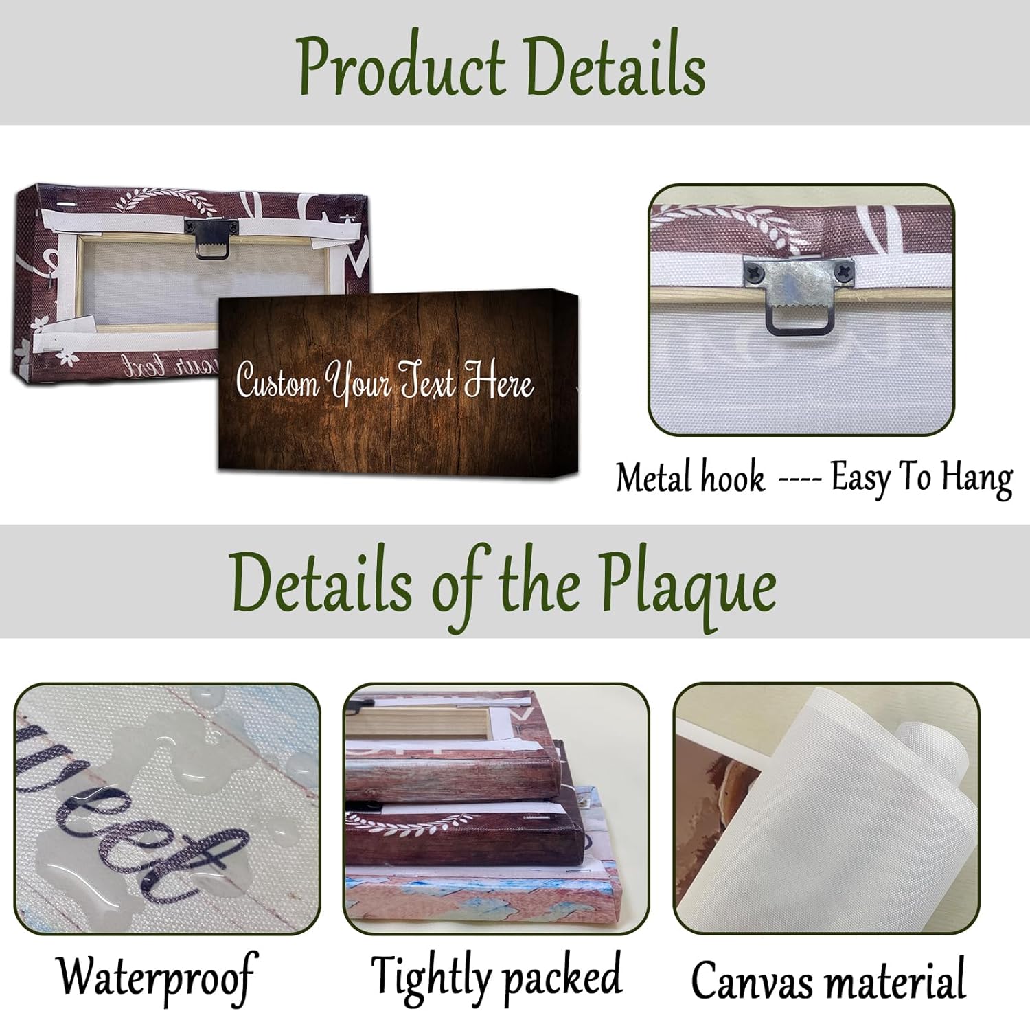 - High Quality Canvas -- Custom text signs wall art are made from high-quality canvas with crisp images and rich colors that won't fade. All personalized wall signs are tightly wrapped in wooden frames, not easy to deform, and the solid wood frames are also equipped with metal hooks, so you can hang it up immediately after receiving the package.