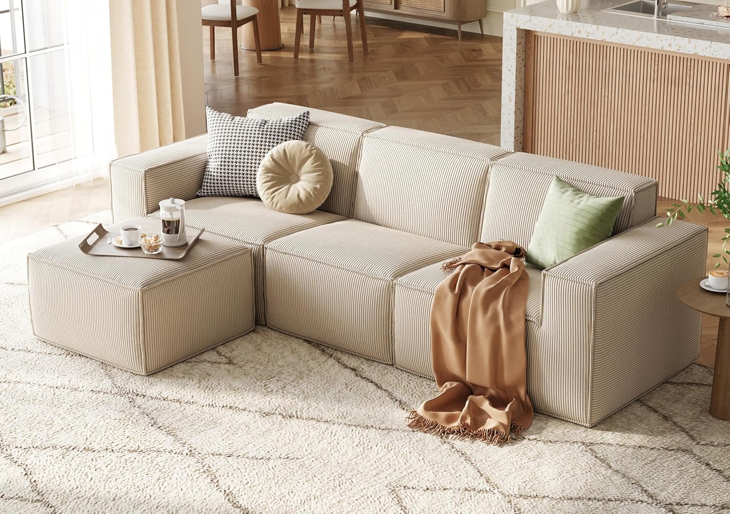 LINSY HOME Modular Sectional Sofa, 105" Boneless Couch L Shaped 3-Seat Sofa with Movable Ottoman, Corduroy Sectional Cloud Couches for Living Room, No Assembly Required, Beige